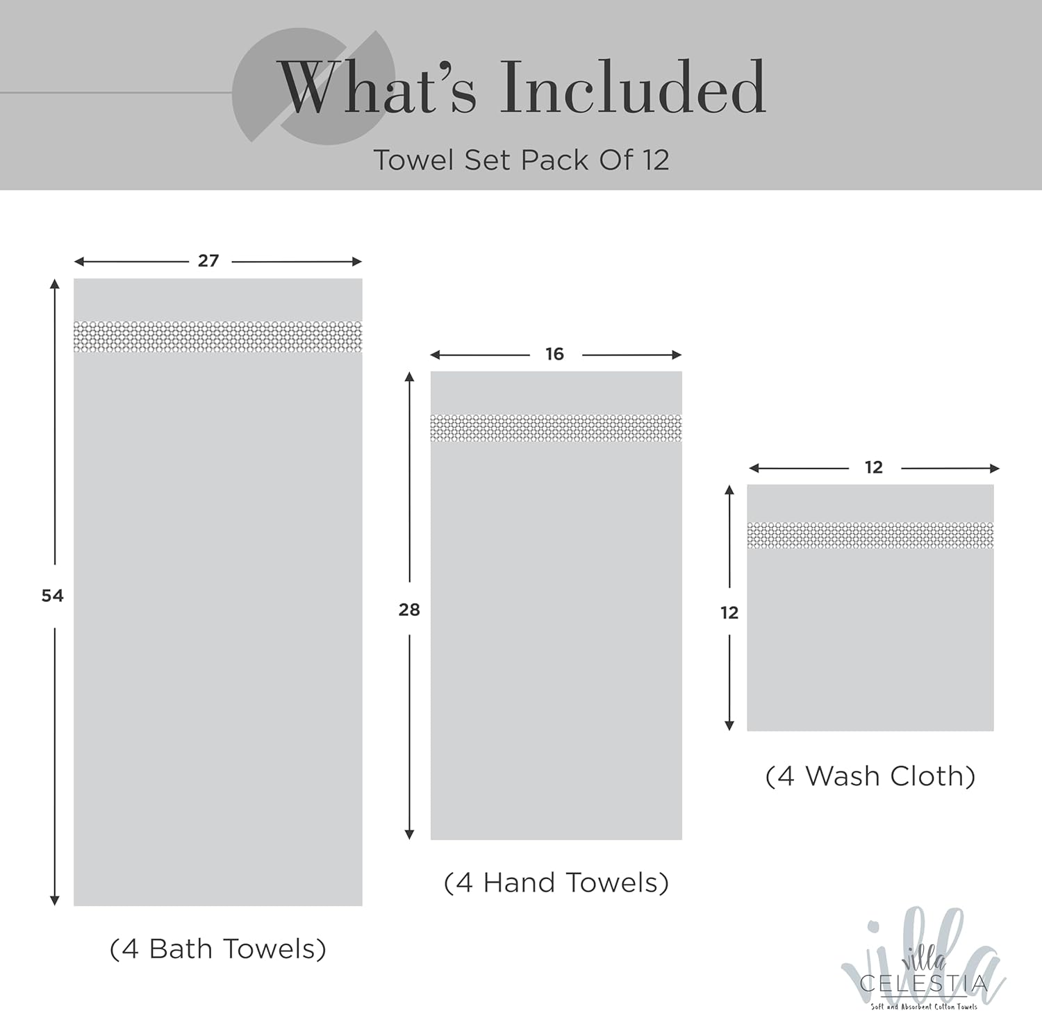 - VILLA CELESTIA LUXURIOUS TOWEL SET (PACK OF 12): Uplift your mood and bathing experience with the super soft and luxurious touch of our Villa Celestia Bath Towels Set. Bundled in a 12 pack design, our towel sets for bathroom consists of 4 Bath Towels (27” X 54”), 4 Hand Towels (16” X 28”), and 4 Washcloths (12” X 12”), giving you the complete package of comfort, indulgence, and delight.