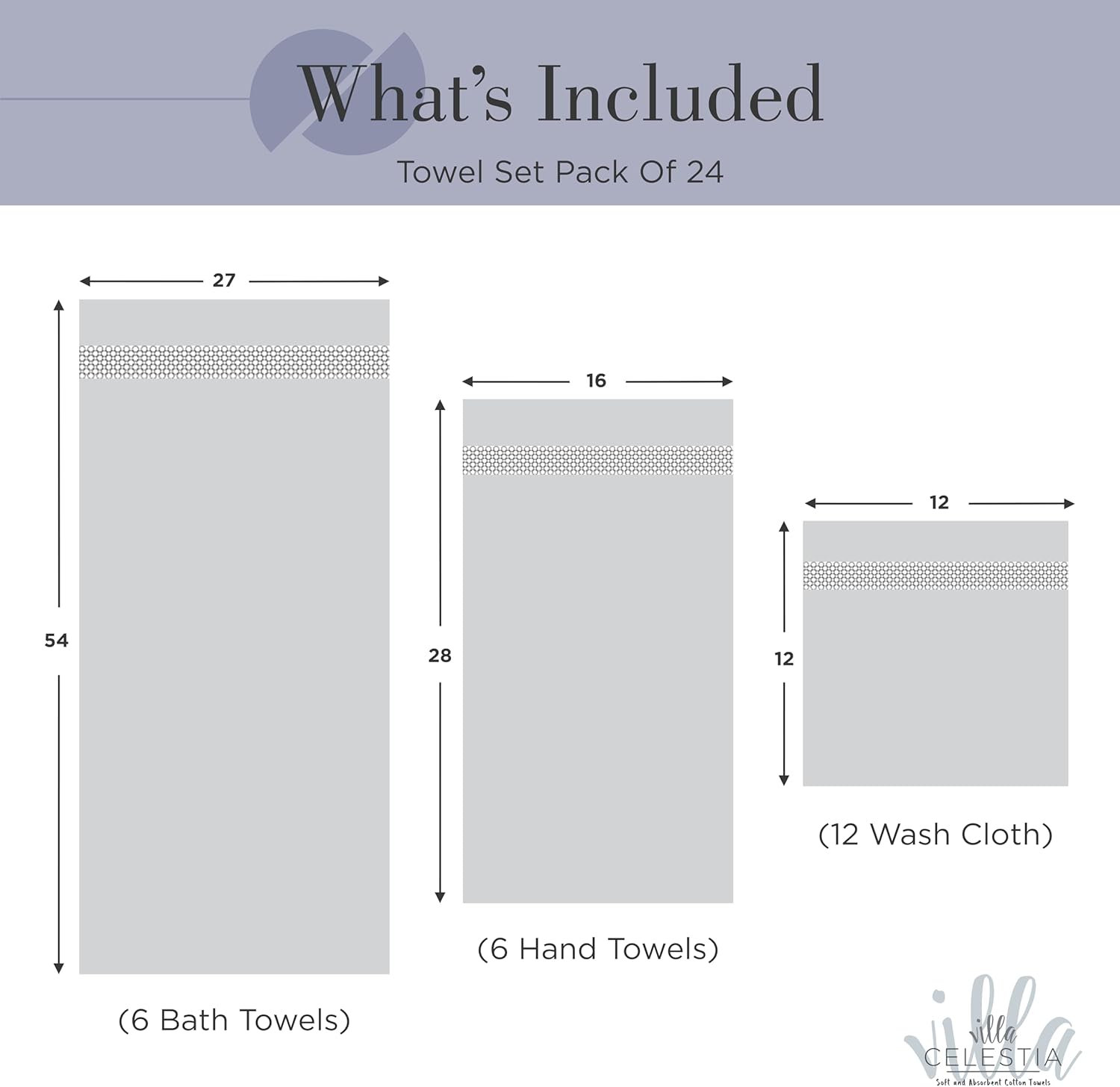 - VILLA CELESTIA LUXURIOUS TOWEL SET (PACK OF 24): Uplift your mood and bathing experience with the super soft and luxurious touch of our Villa Celestia Bath Towels Set. Bundled in a 24 pack design, our towel sets for bathroom consists of 6 Bath Towels (27” X 54”), 6 Hand Towels (16” X 28”), and 12 Washcloths (12” X 12”), giving you the complete package of comfort, indulgence, and delight.