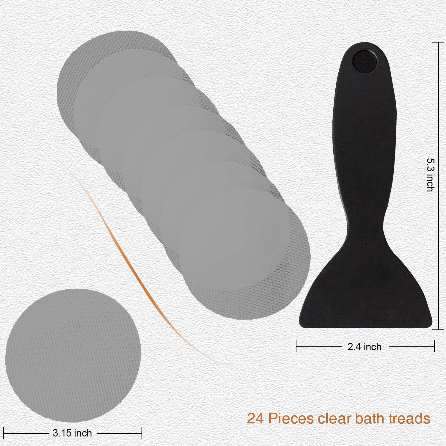 - The package comprises 36 pieces (diameter about 8.0cm or 3.15-inch) of clear stickers alongside 1 high-quality silicone scraper. Ideally, the 36 stickers should occupy the whole surface thereby reducing the risk of accidental slips. On top of that, you can even use these stickers on the stairs to make them much more secure.