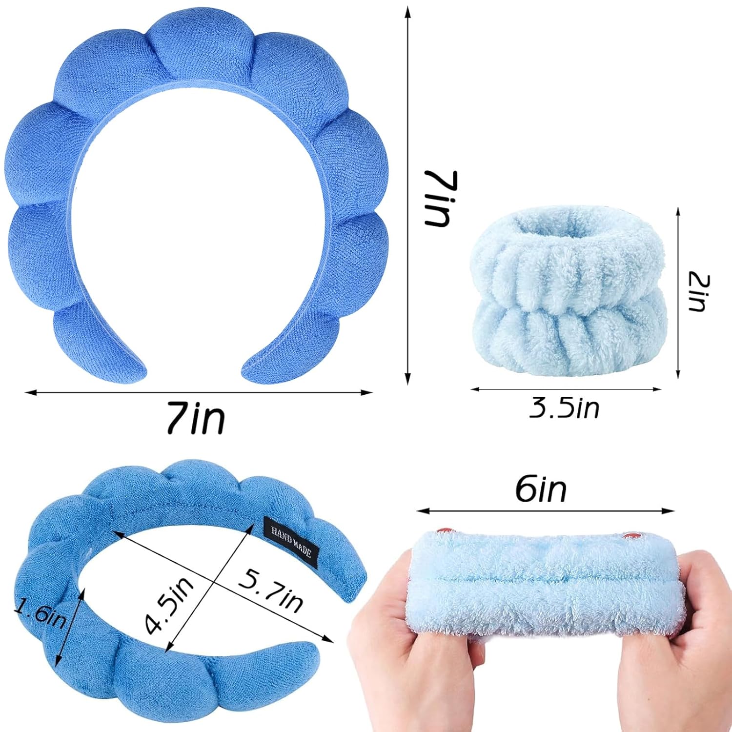 - SPA HEADBAND and WRISTBAND MATERIAL: Patent No.: US D1018980 S. Spa headband and wristband set is the perfect pink gift solution.Bubble Spa headband for women the sponge lining used and the terry cloth covering the surface. These skincare headbands have a strong water absorption function and can be used when you are washing your face, skincare or makeup. The wristbands are made of quality coral fleece.And wristbands also have good elasticity, can be stretched to fit your wrist better