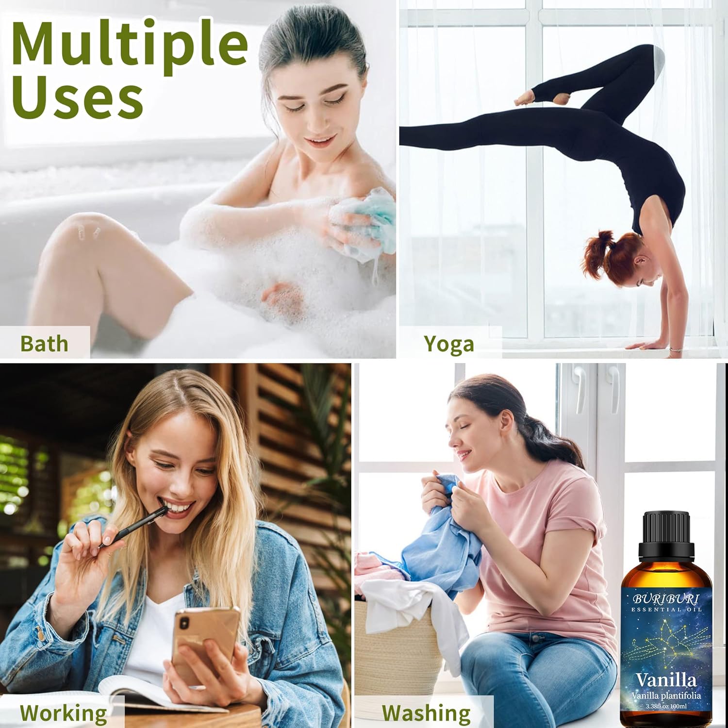 BURIBURI Pure Vanilla Essential Oil and Coconut Oil 100ml Organic Aromatherapy Oils 3.38 fl.oz Coconut Essential Oil for Diffuser Humidifier