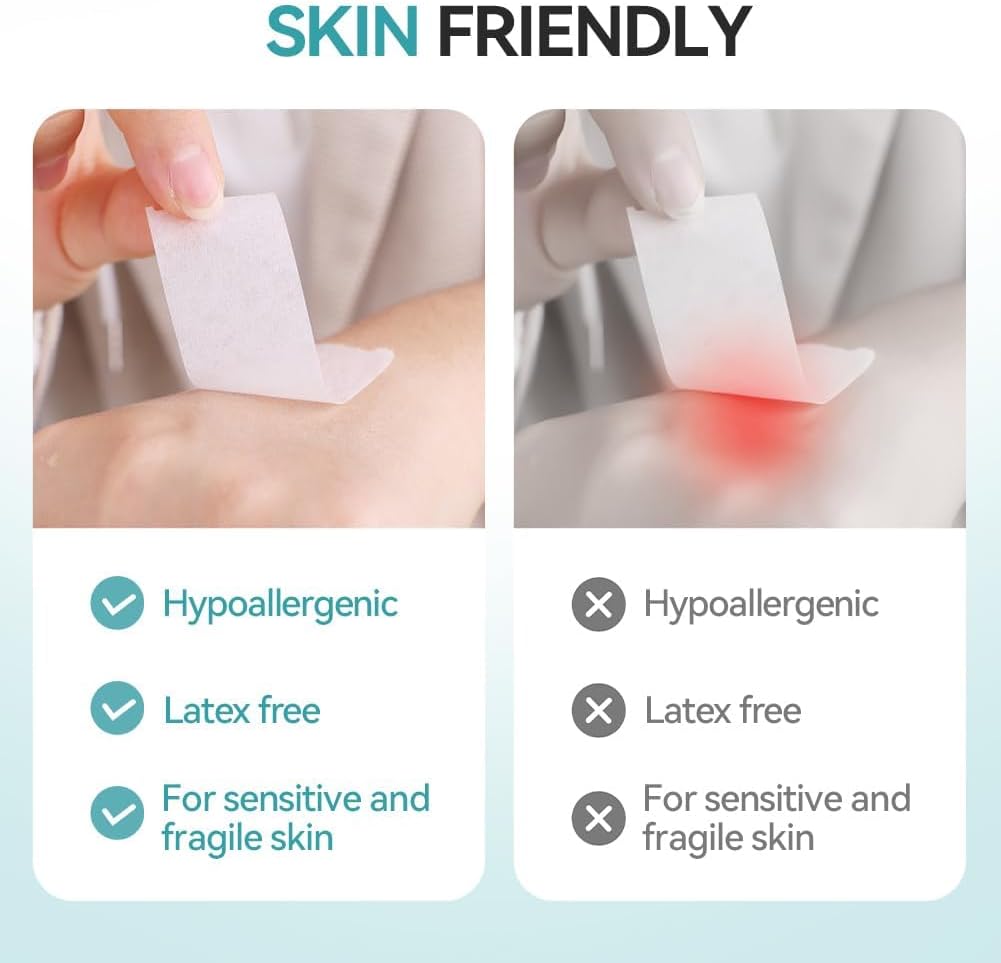 - Skin friendly -this skin safe tape consists of a hypoallergenic non-woven substrate with hot melt adheive glue, latex free. If you are allergic to regular tape that is perfect