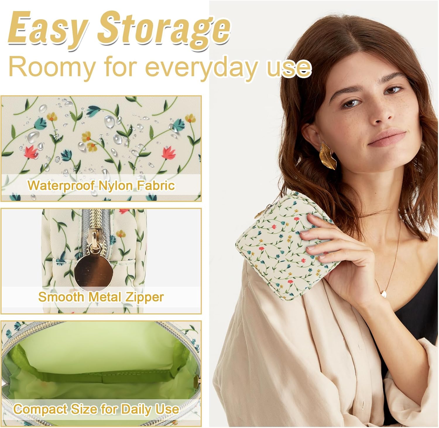- ❤【Multiple Sizes & Colors】Large, Small, Mini, or Slim, we have it all! Cosmetic bags are available in many colors: Blue-Daisy, Green-Daisy, White-Flower, Pink-Flower and other colors for you to choose. Nylon makeup bag for purse can be used for travel, outdoors and organization, it can be used as a purse bag, travel pouch, clutch, makeup organizer and more.