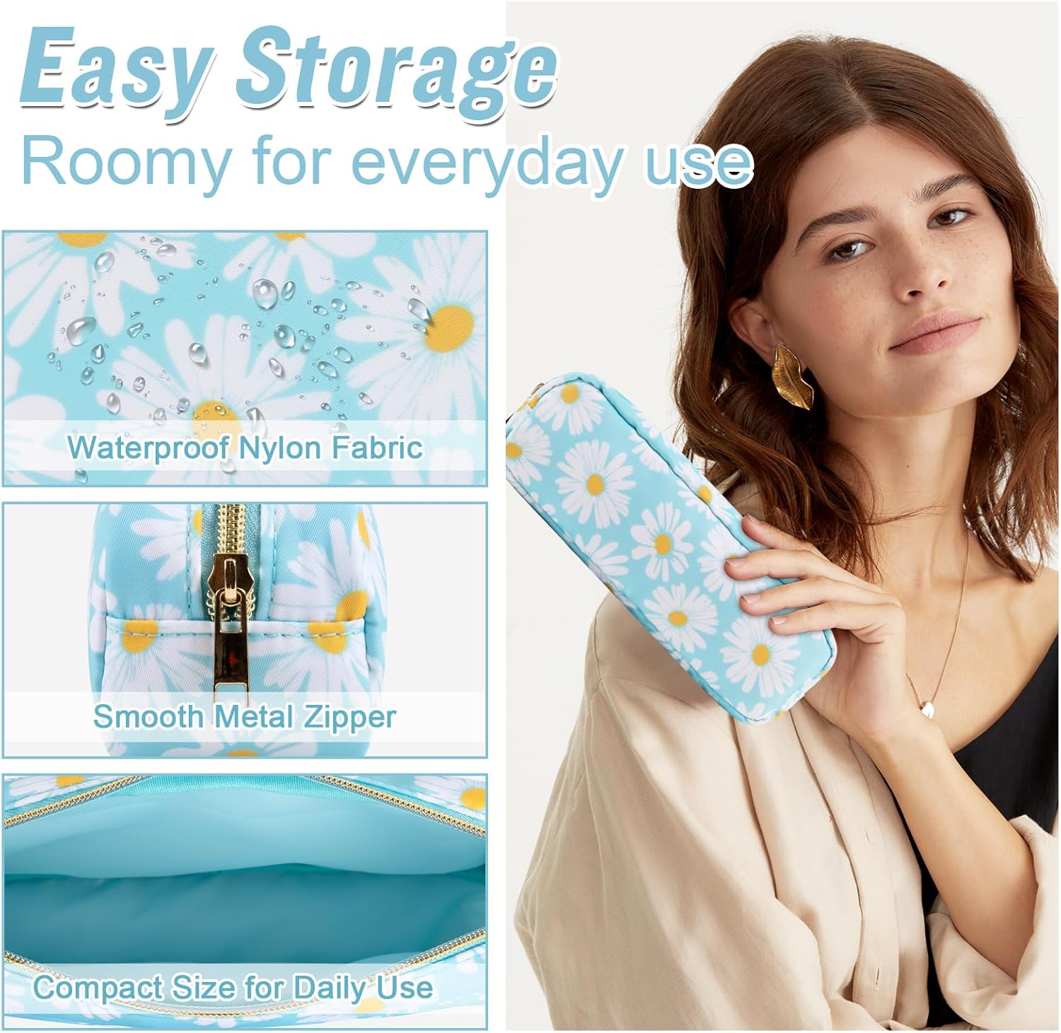 Nylon Small Floral Makeup Bag, Slim Preppy Cute Makeup Brush Case, Waterproof Travel Toiletry Bag, Coin Pouch Make Up Organizer for Women (Blue-Daisy)