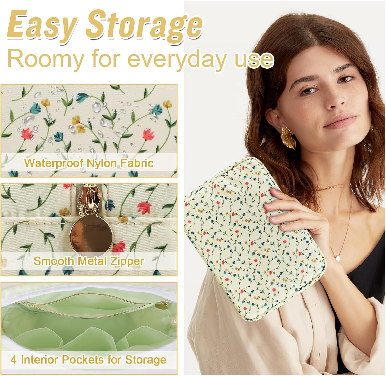 - ❤【Premium Materials】Large floral makeup bag is made of high-quality nylon waterproof material and durable gold zipper, which does not fade, has no peculiar smell, and is durable. Stylish appearance, easy to wipe clean, dustproof and waterproof. The makeup pouch interior is covered with thick sponge to protect your belongings at all times.