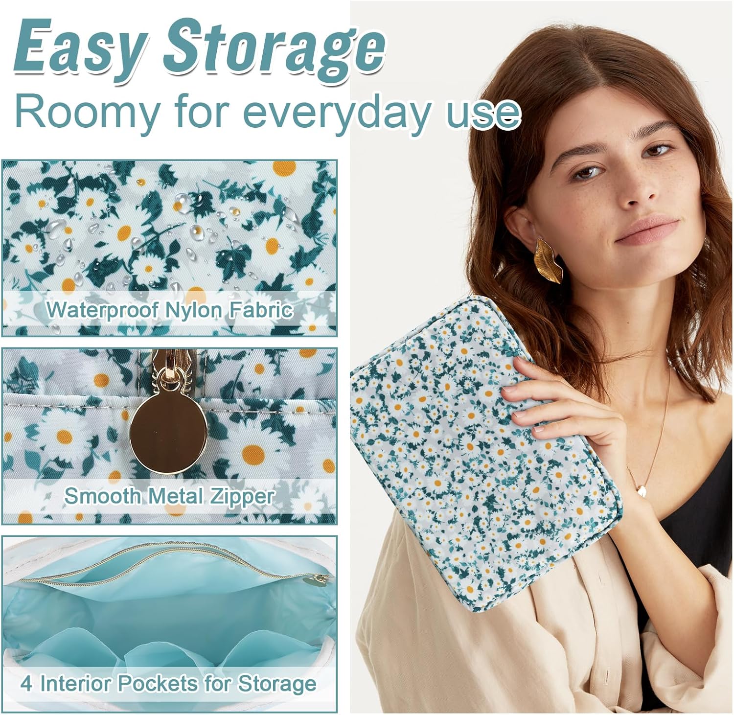 - ❤【Multiple Sizes & Colors】Large, Small, Mini, or Slim, we have it all! Cosmetic bags are available in many colors: Blue-Daisy, Green-Daisy, White-Flower, Pink-Flower and other colors for you to choose. Nylon makeup bag for purse can be used for travel, outdoors and organization, it can be used as a purse bag, travel pouch, clutch, makeup organizer and more.