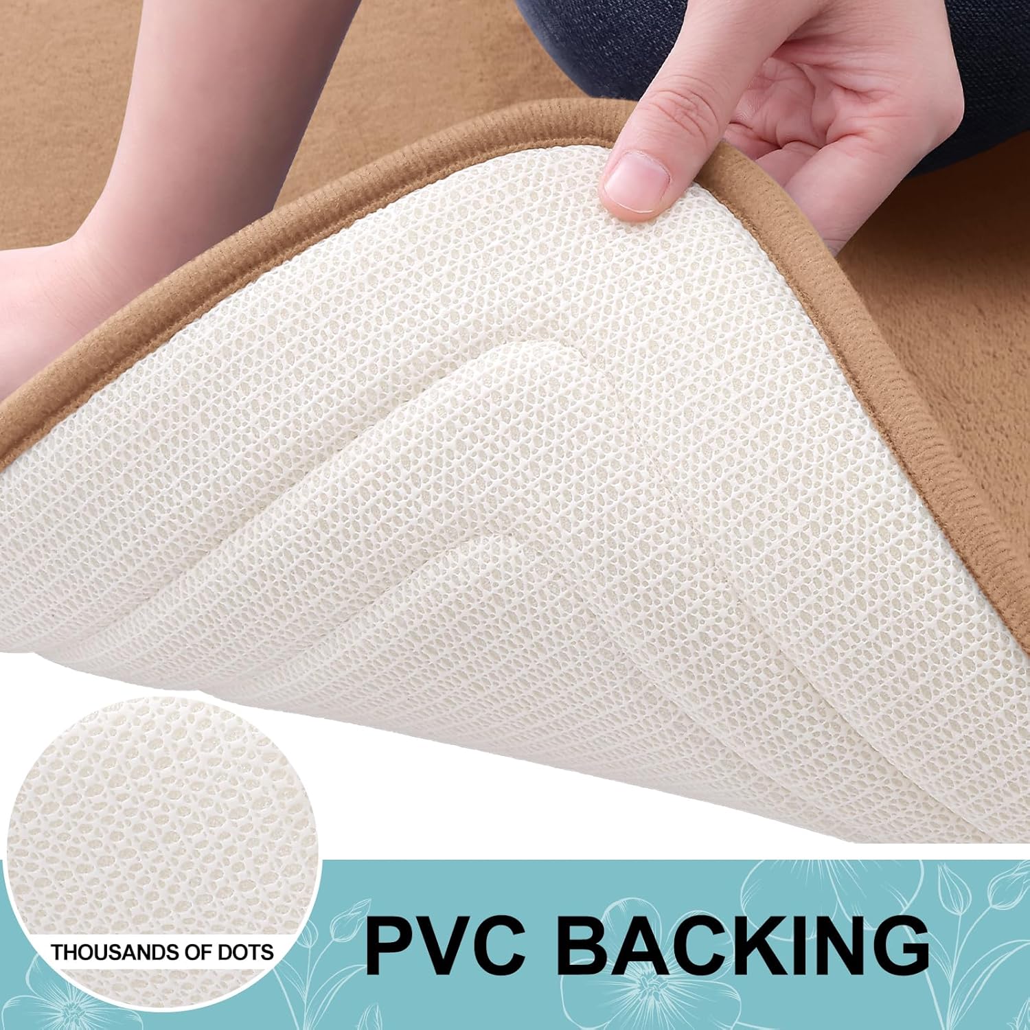 - [STABLE FOOTING] Our bathroom mat is equipped with a robust and enduring PVC backing, preventing shifting and skidding. Unlike mats with rubber backing that may wear off after washing, our bath mat ensures lasting durability. For a secure footing, keep the floor beneath the rug dry and avoid placing it on wet surfaces.
