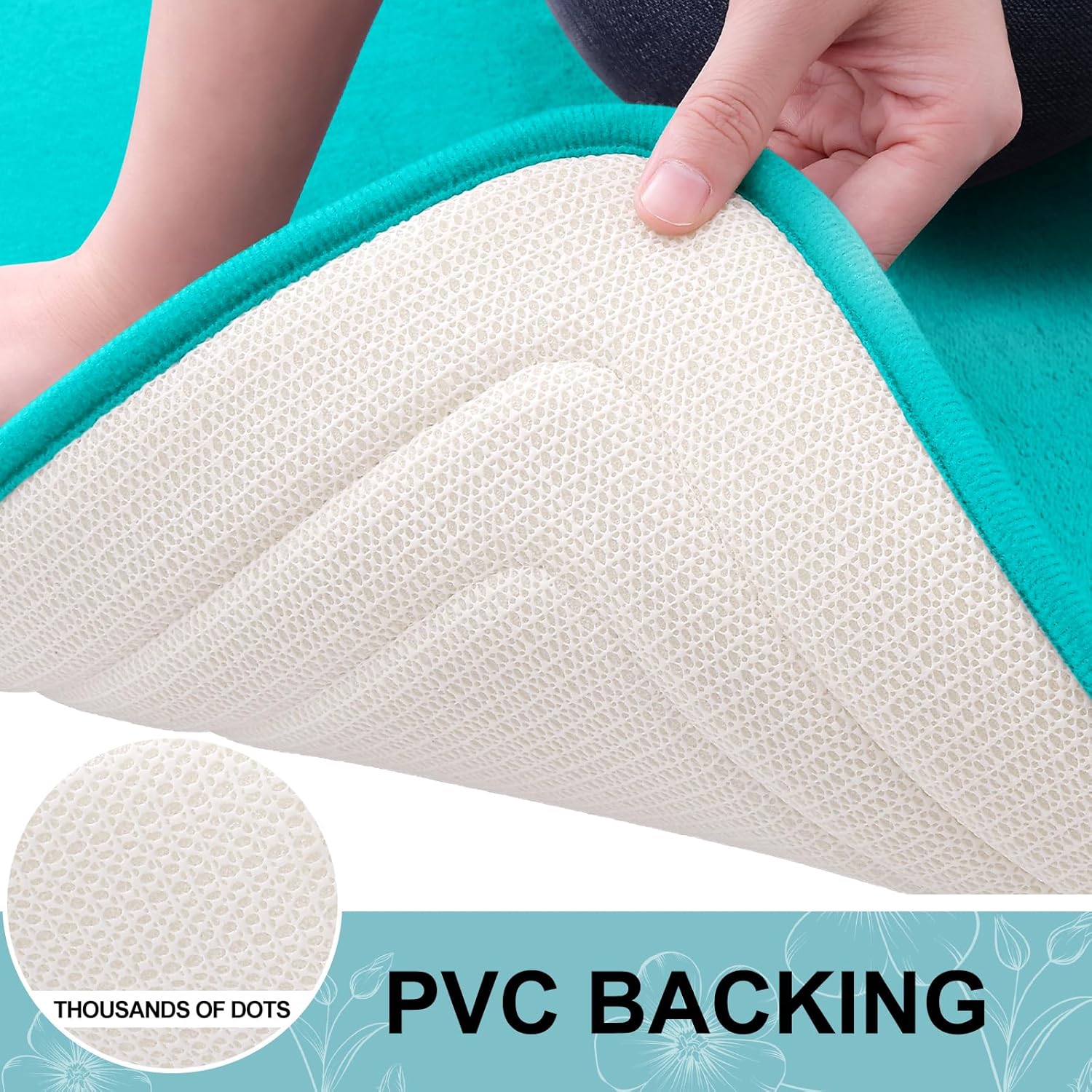 - [STABLE FOOTING] Our bathroom mat is equipped with a robust and enduring PVC backing, preventing shifting and skidding. Unlike mats with rubber backing that may wear off after washing, our bath mat ensures lasting durability. For a secure footing, keep the floor beneath the rug dry and avoid placing it on wet surfaces.
