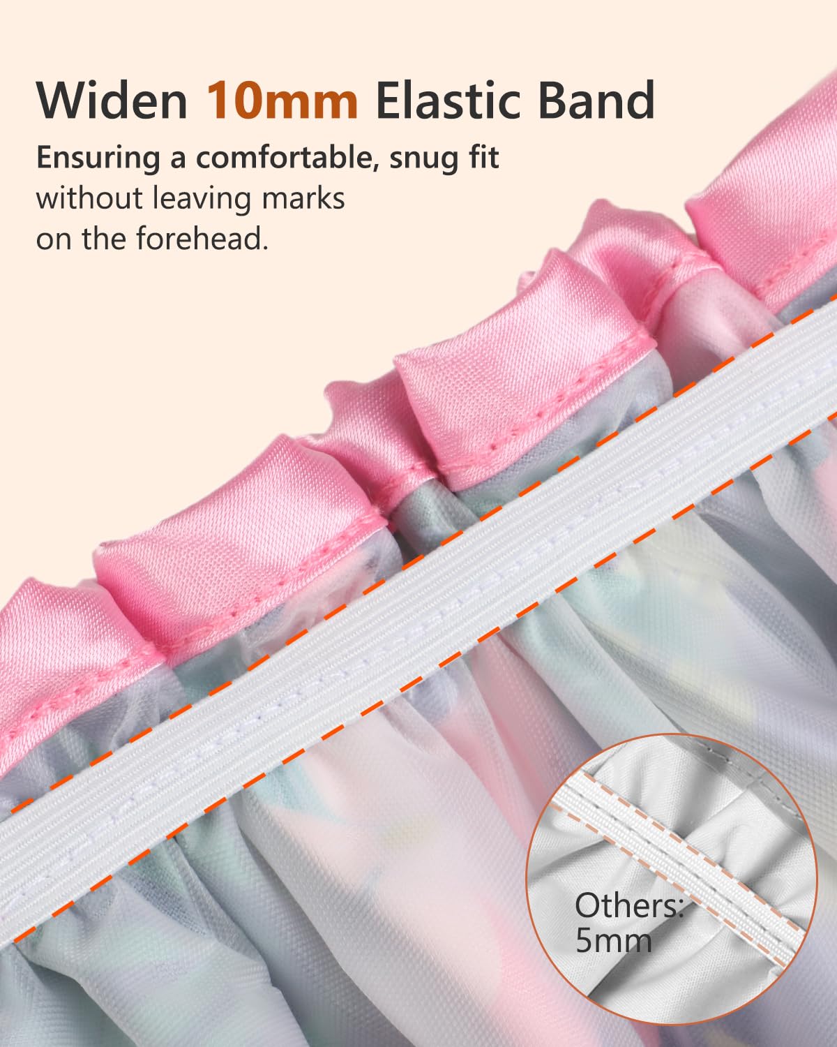 - 🎈Superb Waterproof -- This shower cap features a double layer and a wide elastic band, ensuring a snug fit without leaving marks. The unique 20mm lace curves outward at a 30-45 degree angle, effectively isolating water droplets and keeping the forehead and neck dry.