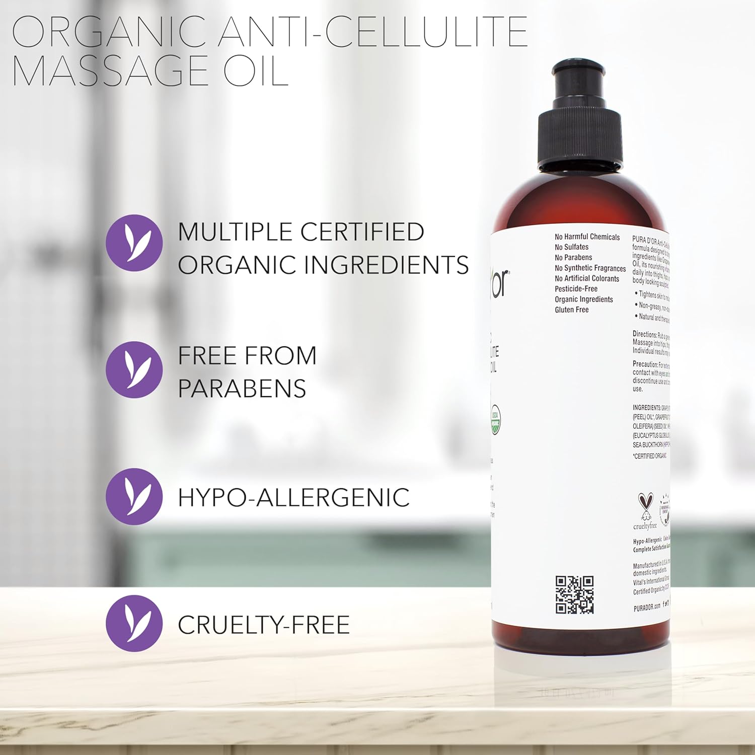 PURA D'OR 16 Oz Organic Anti-Cellulite Massage Oil - Lemon Peel, Moringa, Grape Seed, Grapefruit & Eucalyptus Oils - Skin Firming & Tightening for Active Individuals & Aging Adults