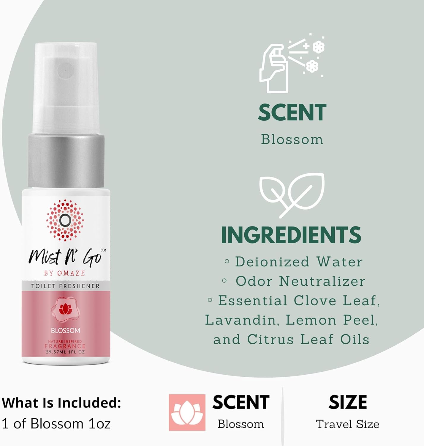 Mist N’ Go by Omaze Travel Bathroom Spray for Toilet Spray Odor Eliminator - Travel Toilet Spray for Bathroom Air Freshener Spray for Bathroom Deodorizer - Blossom Travel Size (1oz x1)
