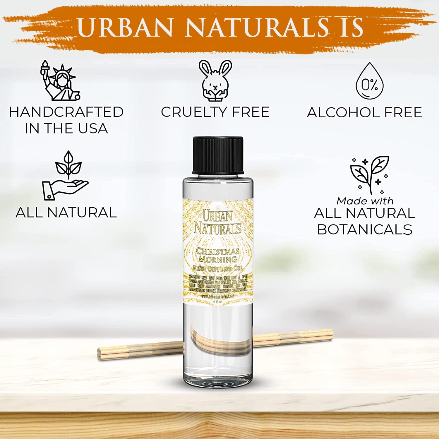 Urban Naturals Reed Diffuser Oil Refill Christmas Morning, Rosemary, Eucalyptus, Balsam Spruce, Orange, Essential Oils, 4 oz + Free Reed Sticks, Made in The USA