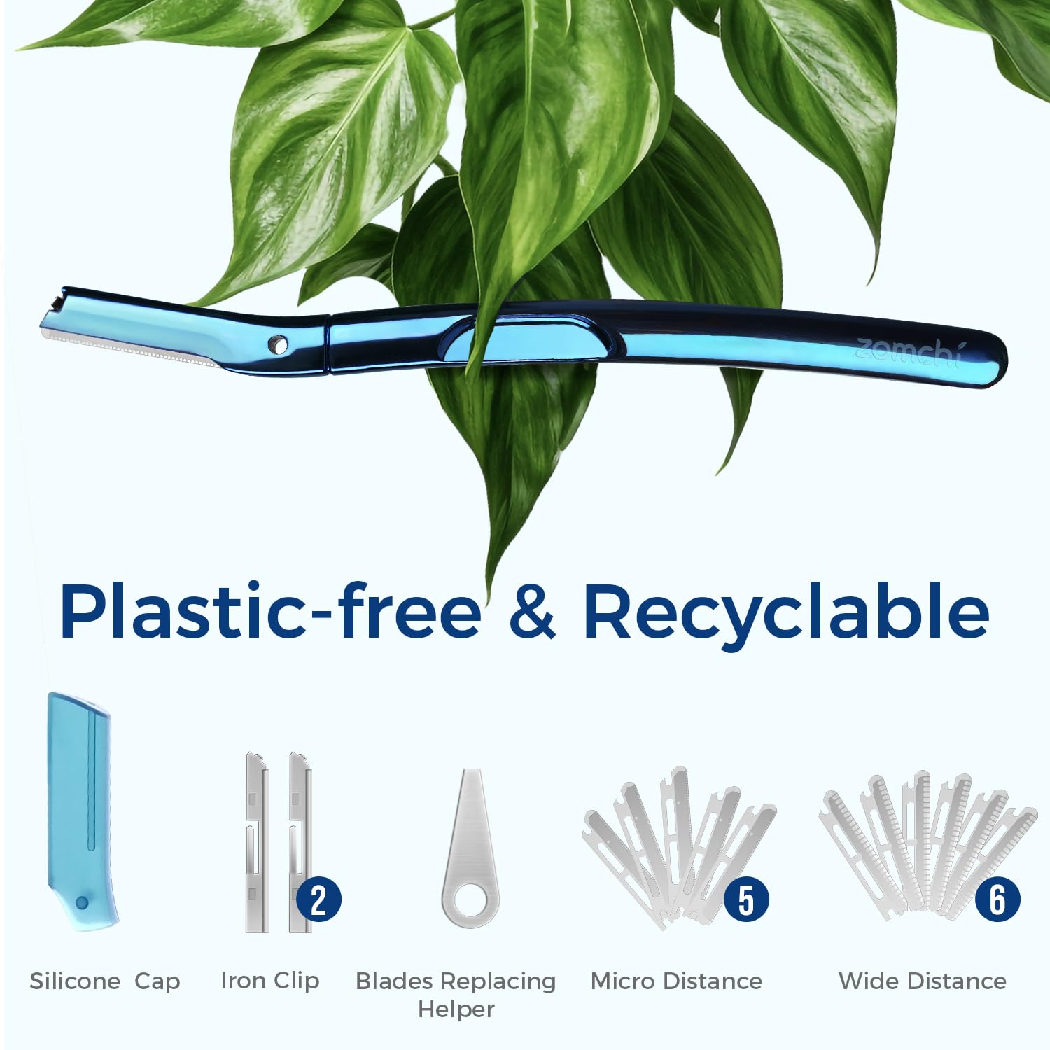- PREMIUM METALLIC DESIGN NOBLE SENIOR BLUE: ZOMCHI’s new and upgraded exfoliating and dermaplaning tool is crafted with a luxurious metal feel. Stand out with style as our eyebrow trimmer flaunts an advanced and luxurious blue color. This premium shade adds a touch of sophistication to your beauty kit.