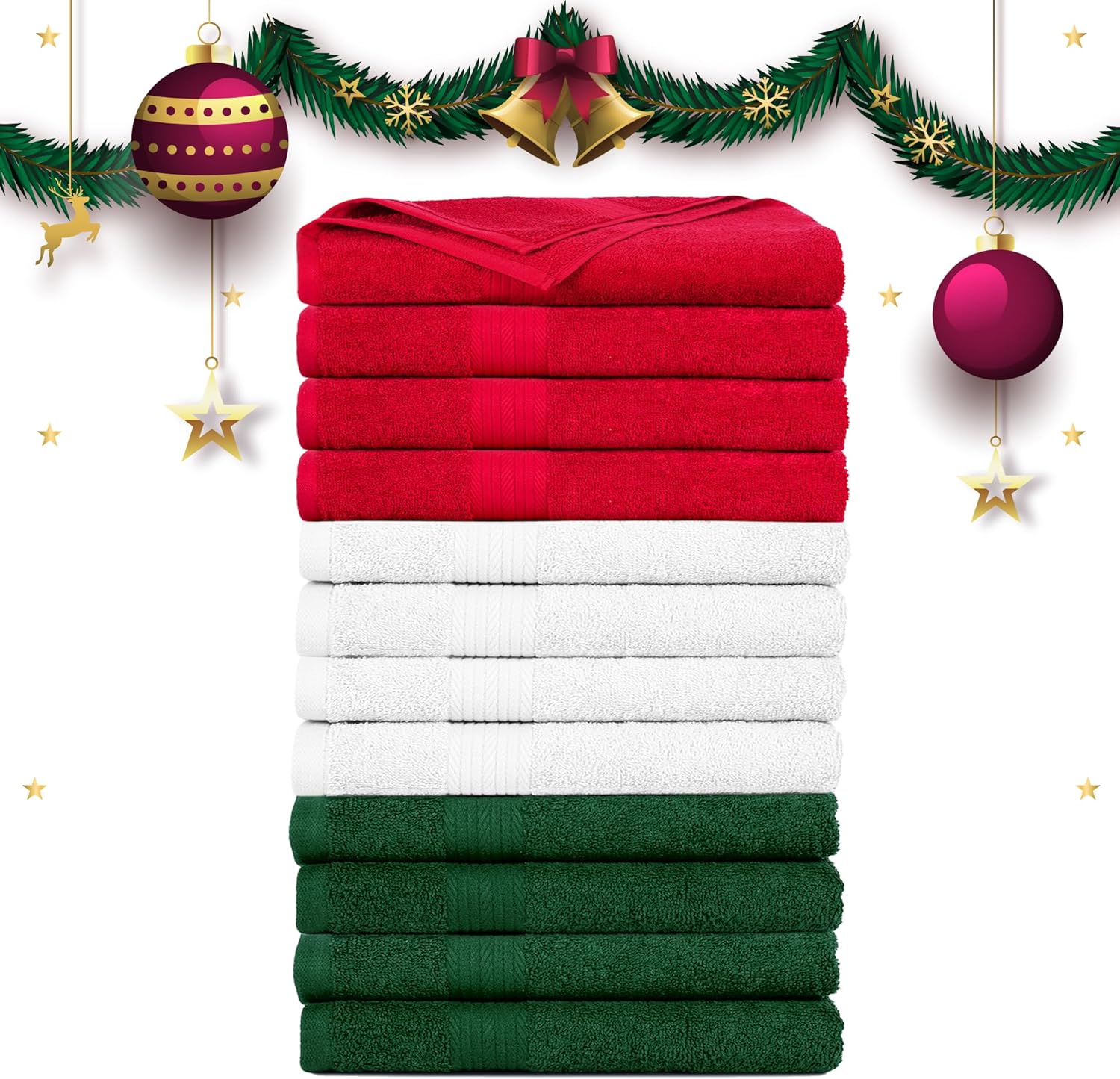 Ample Decor Hand Towels Set of 12 for Bathroom 100% Cotton 18 X 28 Inch 600 GSM Quick Drying - White, Red & Green