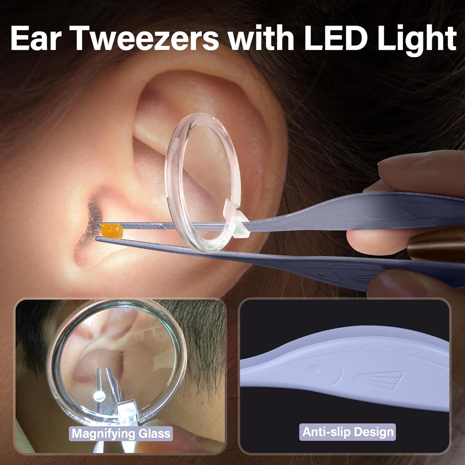 - 【SUITABLE FOR ALL AGES】-The kit comes with LED lights and 4 ear scoops, which also comes with two silicone ear scoops and a 2x magnifying glass to make it easier to see the ear canal, and its soft rounded scoop tips are ideal for ear wax removal for kids and adults. Our ear tweezers with light effectively treat both dry and wet earwax.