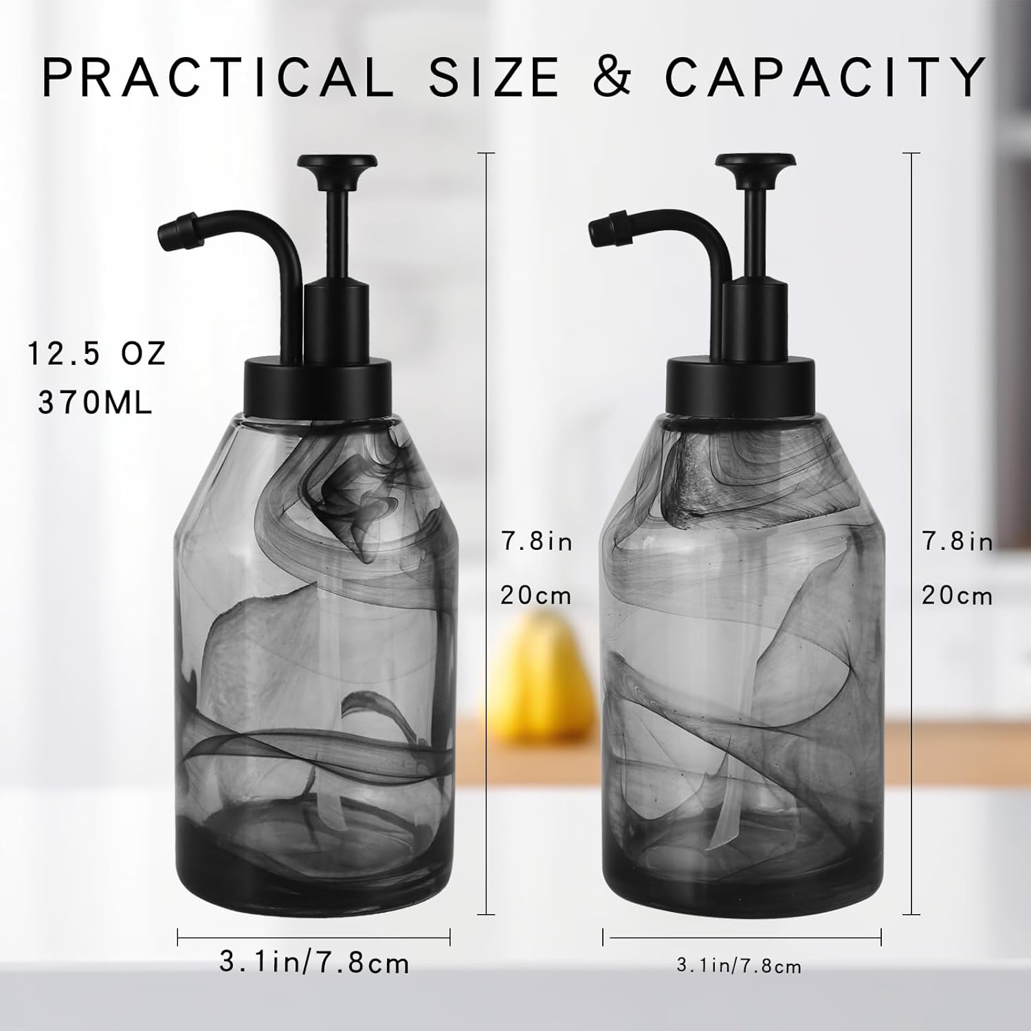 Bathroom Glass Soap Dispenser Set, 2 Pack 12.5 Oz Unique 3D Black Smog Thick Glass Hand Soap Bottle with Smooth Action Rust-Free ABS Pump, Kitchen Dish Soap Dispenser (Black)