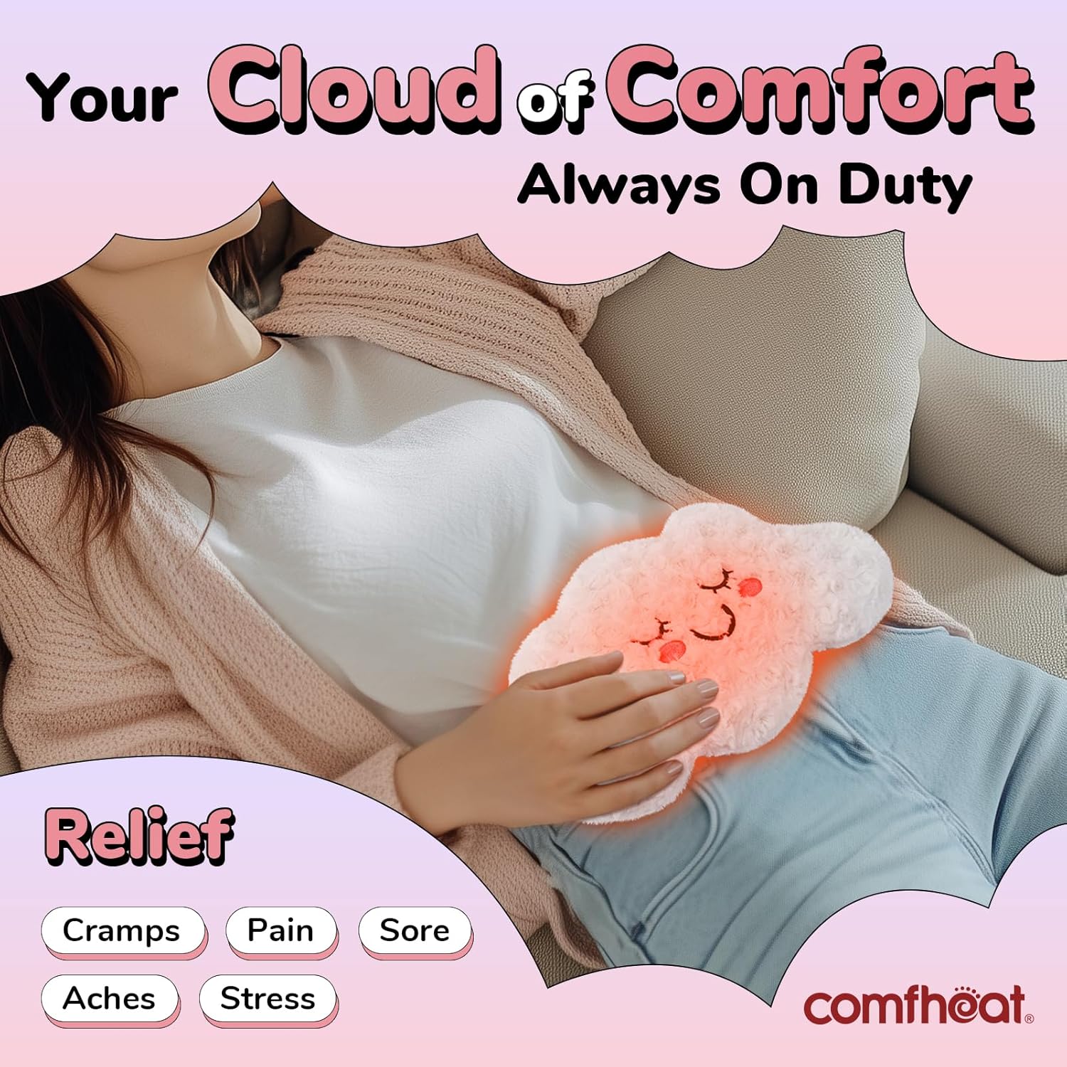 - MOIST HEAT COMPRESS FOR PAIN RELIEF: Just remove the cramps heat pack from the plush cloud and heat it in the microwave for 55-65 seconds to release soothing moist heat that increases blood circulation and effectively relieves pain in the lower abdomen, back, shoulder, joint and muscle. Why not say goodbye to traditional wired heating pads and try a whole new experience?