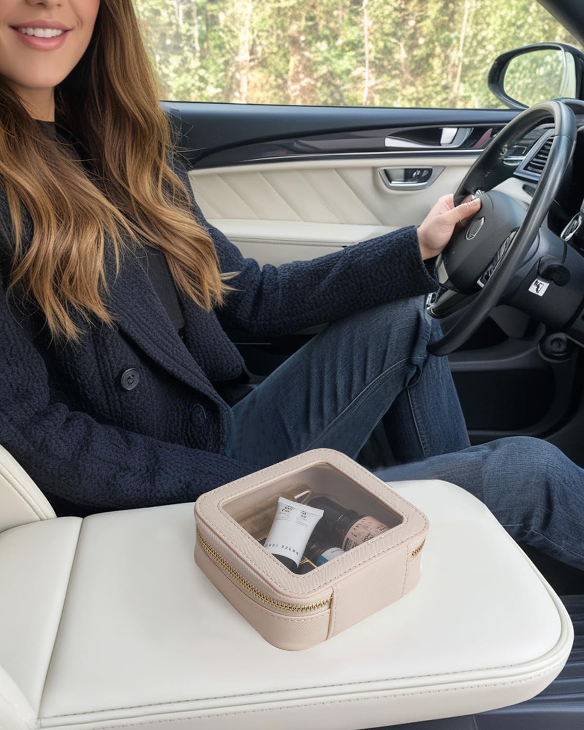 • Car Must Have Essential: Our car essentials small pouch travel toiletry bag is roomy to store your makeup brushes, lipstick, eyebrow pencil, make-up foundation, cables, chargersor and other little items.It make your daily make-up, cream, lipstick, perfume and other beauty things organized and protected.This clear mini toiletry bag can be a good car accessory fits in the center console or other parts of your car