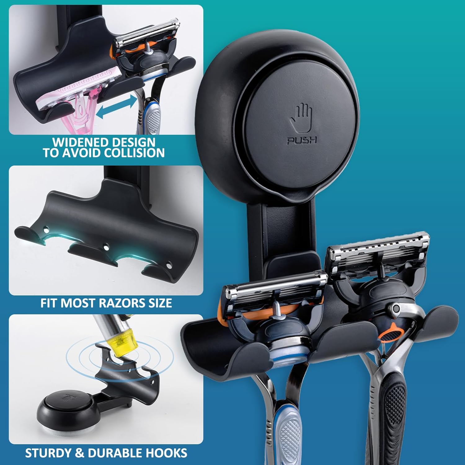 - Fit for most razors: The bracket of the shower suction hooks is designed with special curve to fit most razors. The shaver holder hooks can hold most types of razors stably without falling off. No Worries! Each holder can hang two razors. Great gift for dad on Father's day