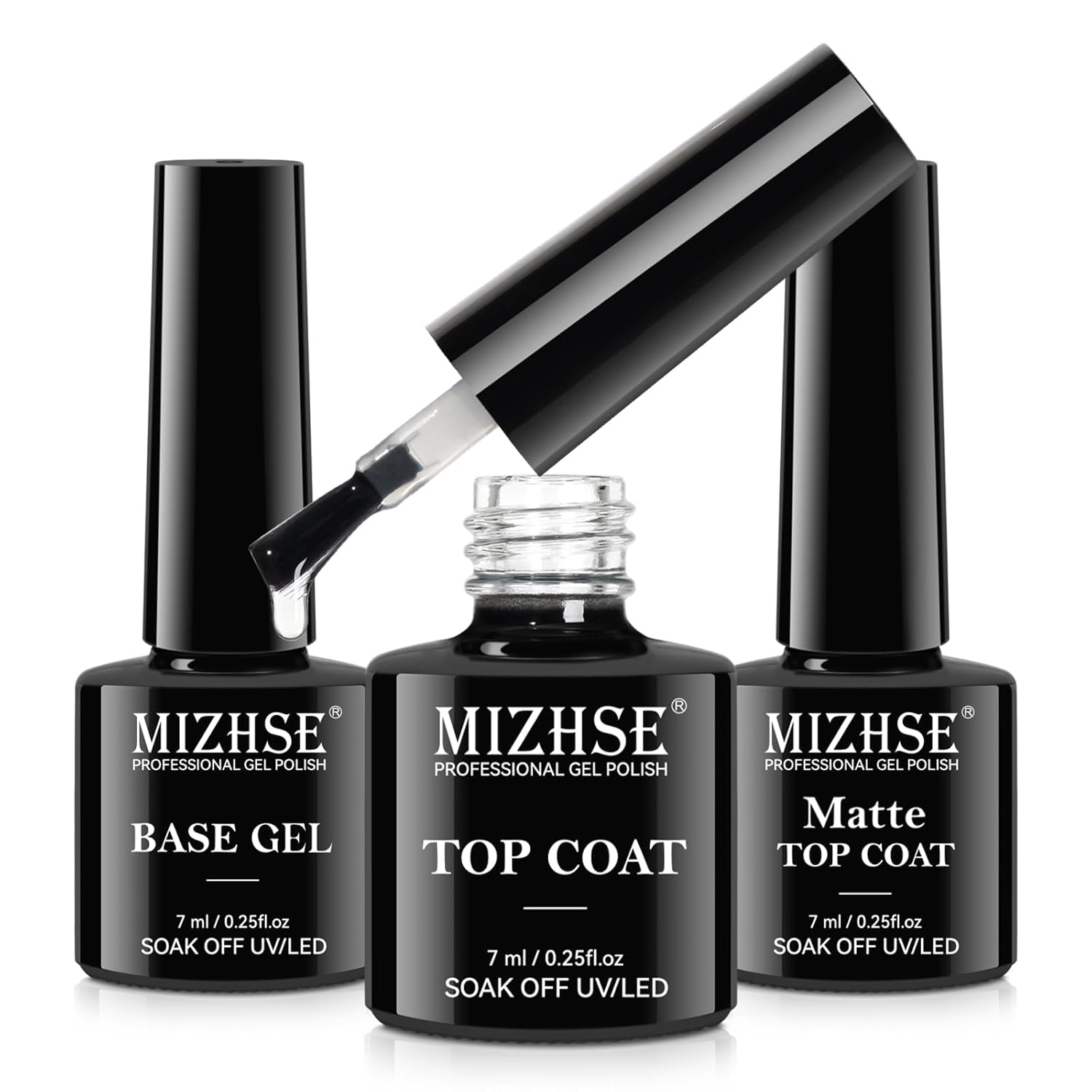 - MIZHSE Gel Base and Top Coat: Achieve a salon-quality manicure at home with a 28+ day long-lasting formula that provides perfect shine. This base and top coat combo eliminates the sticky layer, leaving nails smooth glossy polished. The intricately designed brush makes it more convenient and quick to apply on nails.