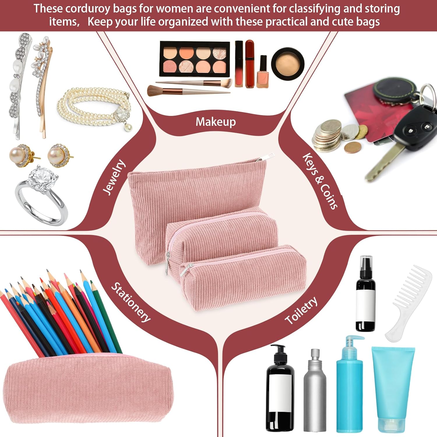 - Material and Attractive Design: the makeup and toiletry travel bag set is mainly crafted from quality corduroy material, ensuring high durability and prolonged service life; The bags feature solid pink color design in different sizes; This makes them compatible with various styles of outfits