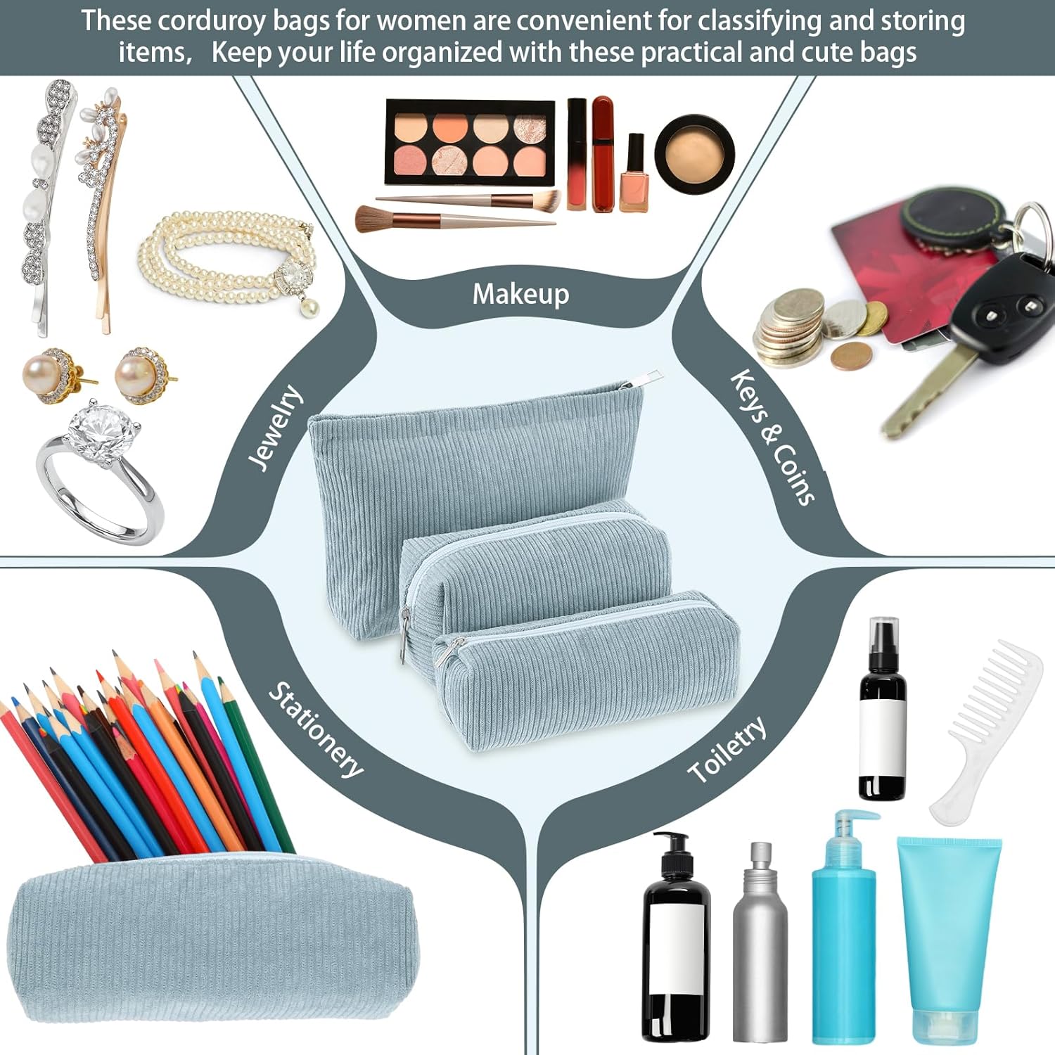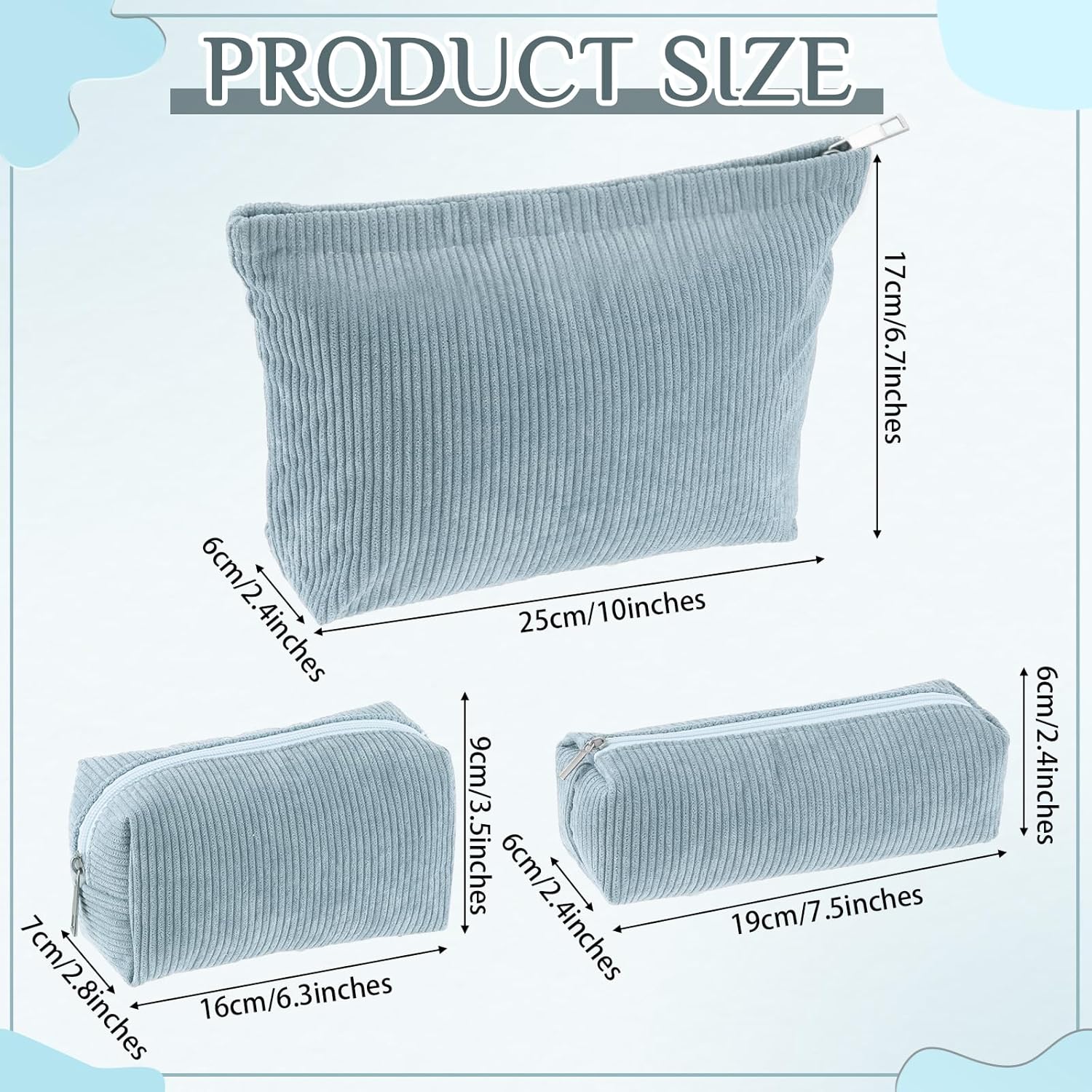 3 Pcs Makeup Bag Set for Women Corduroy Cosmetic Pouch Aesthetic Smile Travel Toiletry Bag Cute Purse Pouch Pencil Case Makeup Brushes Storage Organizer for Christmas(Blue,Solid Style)