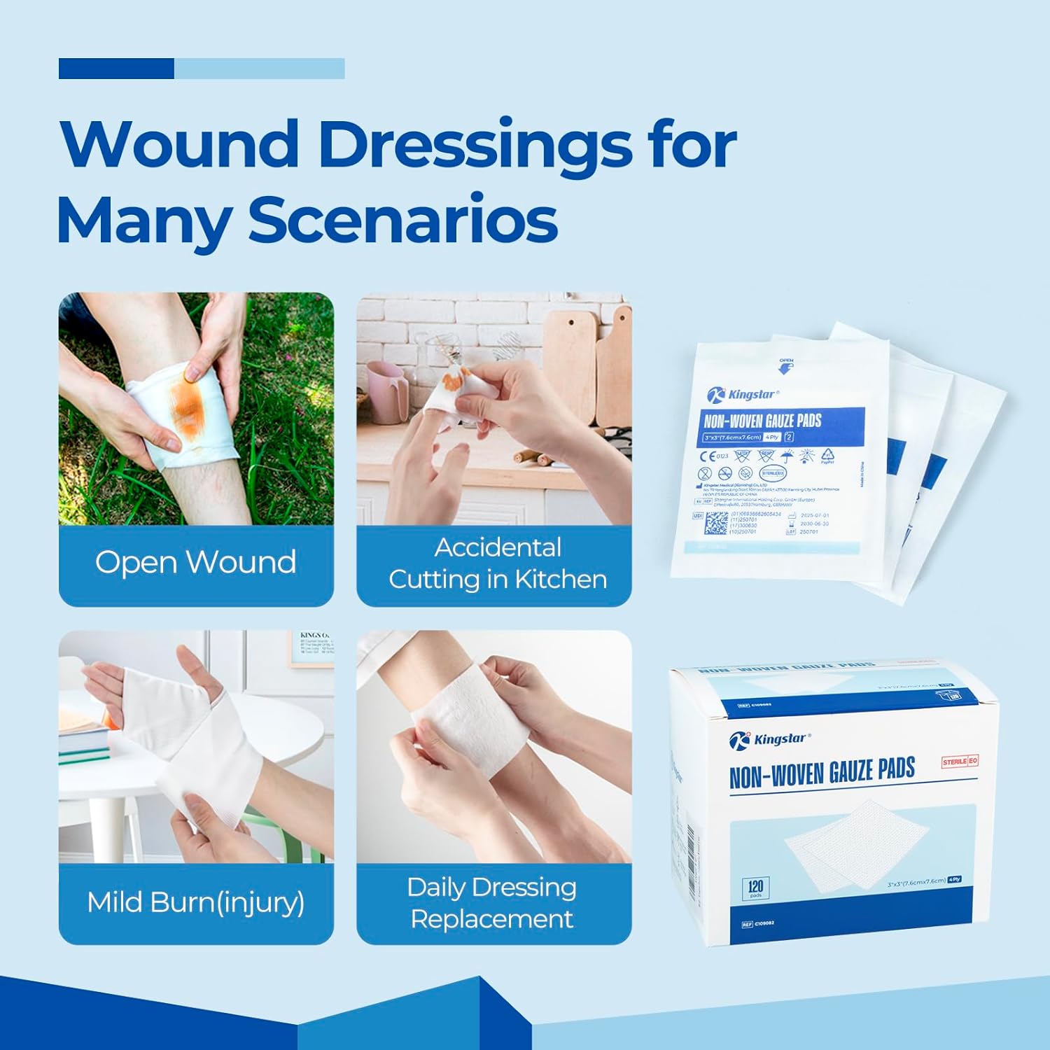 - Sterile Packaging: Each box contains 60 pouches of 120 sterile Nonwoven gauze sponges. Each piece of swabs is well made and has no exposed raw edges, less lint than normal gauze, helpful to avoid further irritation caused by wrapping bandages