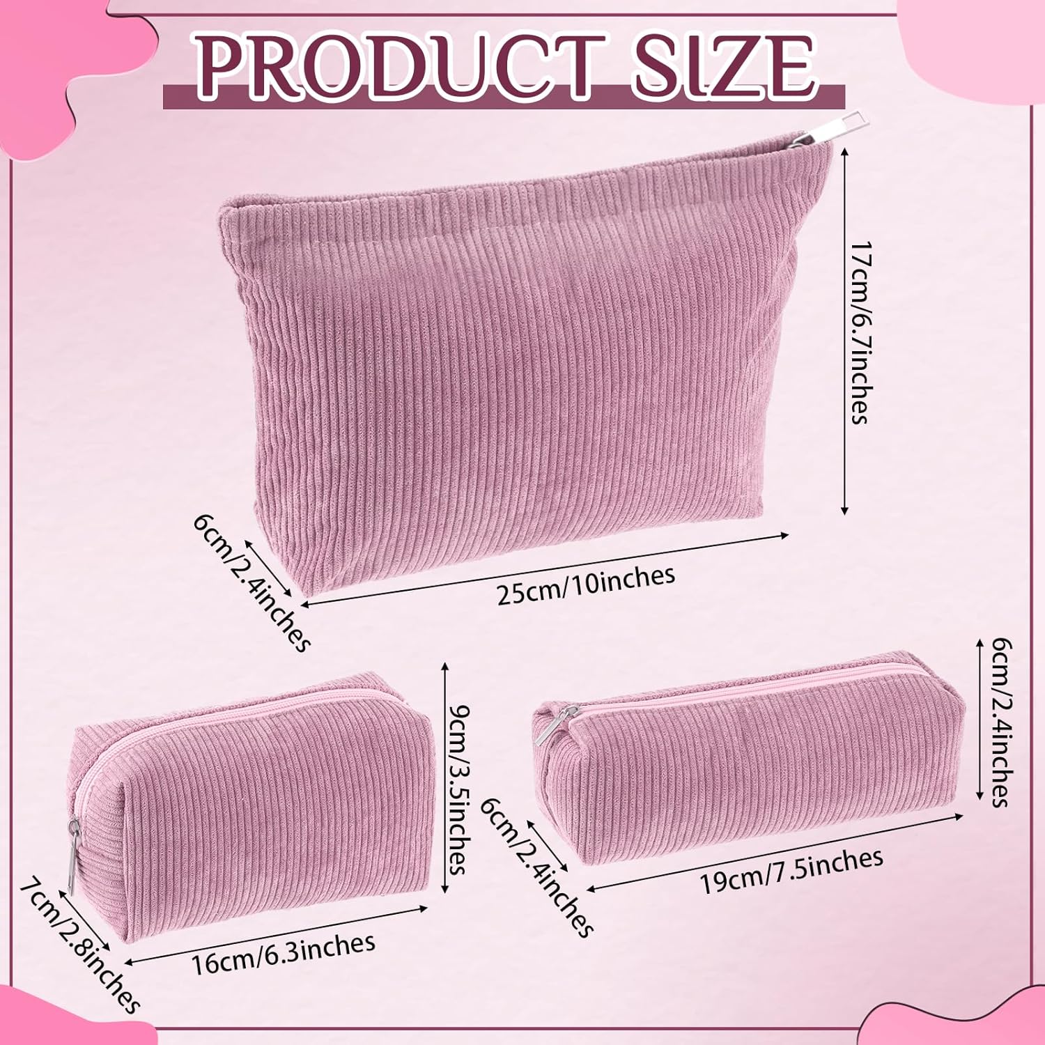 - Dimensions to Suit Your Needs: coming in 3 different sizes, about 10 x 2.4 x 6.7 inches/ 25 x 6 x 17 cm, about 6.3 x 2.8 x 3.5 inches/ 16 x 7 x 9 cm, and about 7.5 x 2.4 x 2.4 inches/ 19 x 6 x 6 cm, these corduroy bags for women are convenient for classifying and storing items; Keep your life organized with these practical and cute bags
