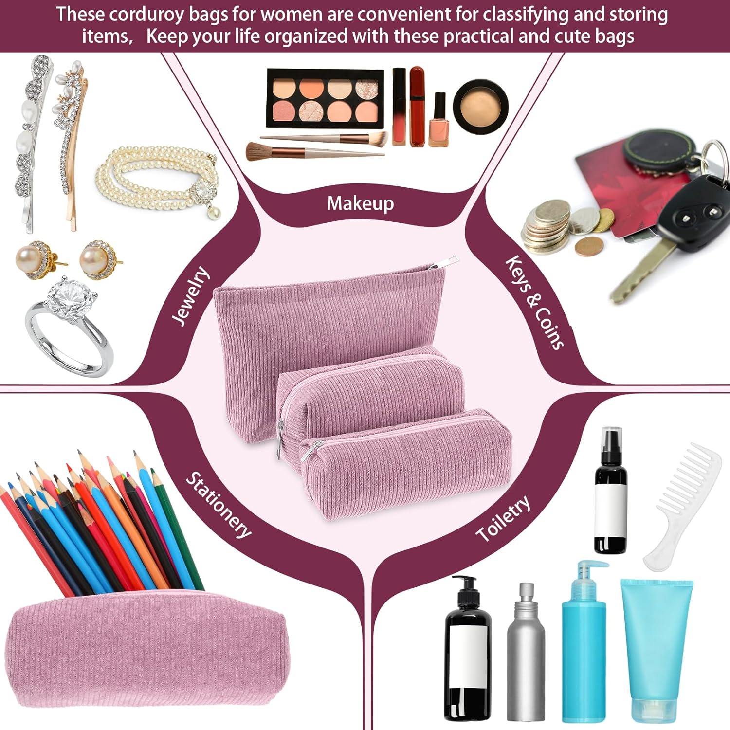 - Material and Attractive Design: the makeup and toiletry travel bag set is mainly crafted from quality corduroy material, ensuring high durability and prolonged service life; The bags feature solid rose pink color design in different sizes; This makes them compatible with various styles of outfits