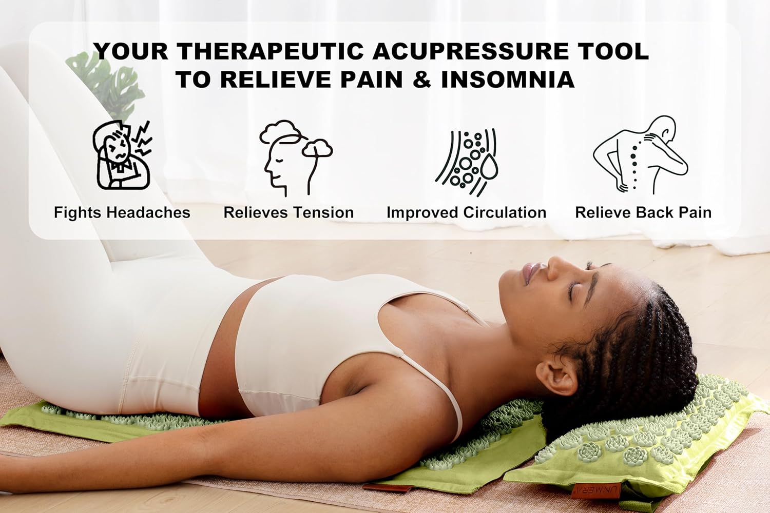 - RELAX MUSCLES AND RELEASE PRESSURE:Just use Acupressure mat and pillow for 10-30 minutes a day, the body will release endorphins through acupuncture points to relieve back pain and neck pain. at the same time, the Acupressure pillow filled with buckwheat husks can release the pressure of the day.