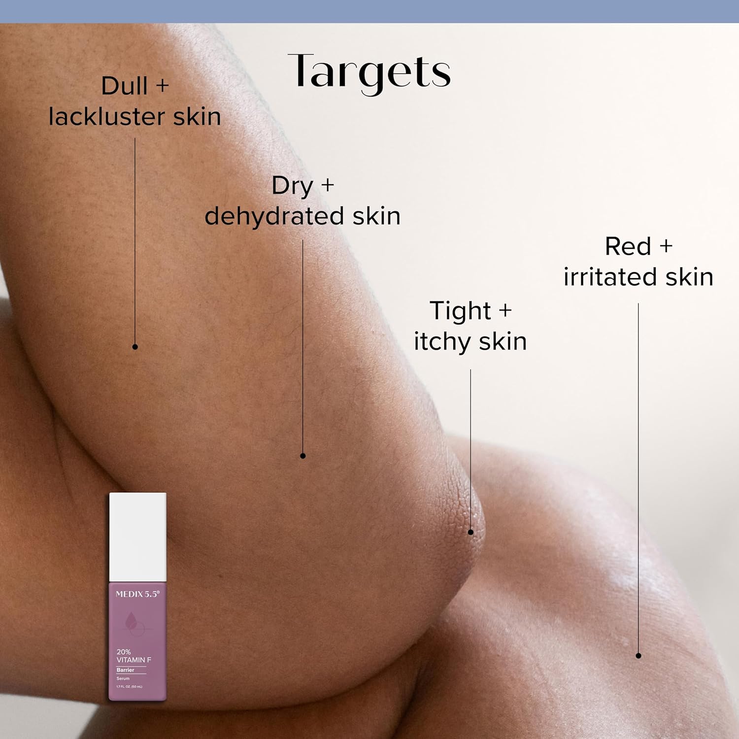- BOOSTER – Supercharge your regular daily skin care routine by adding this highly concentrated Vitamin F Booster Serum formulated to be combined with your favorite Medix 5.5 body treatment cream. A rich moisture bomb of Vitamin F replenishes tight dry skin, helps protect skin against premature aging, & supports a healthy skin barrier. Compatible with all skin types, even sensitive skin + acne prone skin. Fragrance-Free, Dermatologist-Tested, Allergy-Tested, & Clinically-Tested Formula.