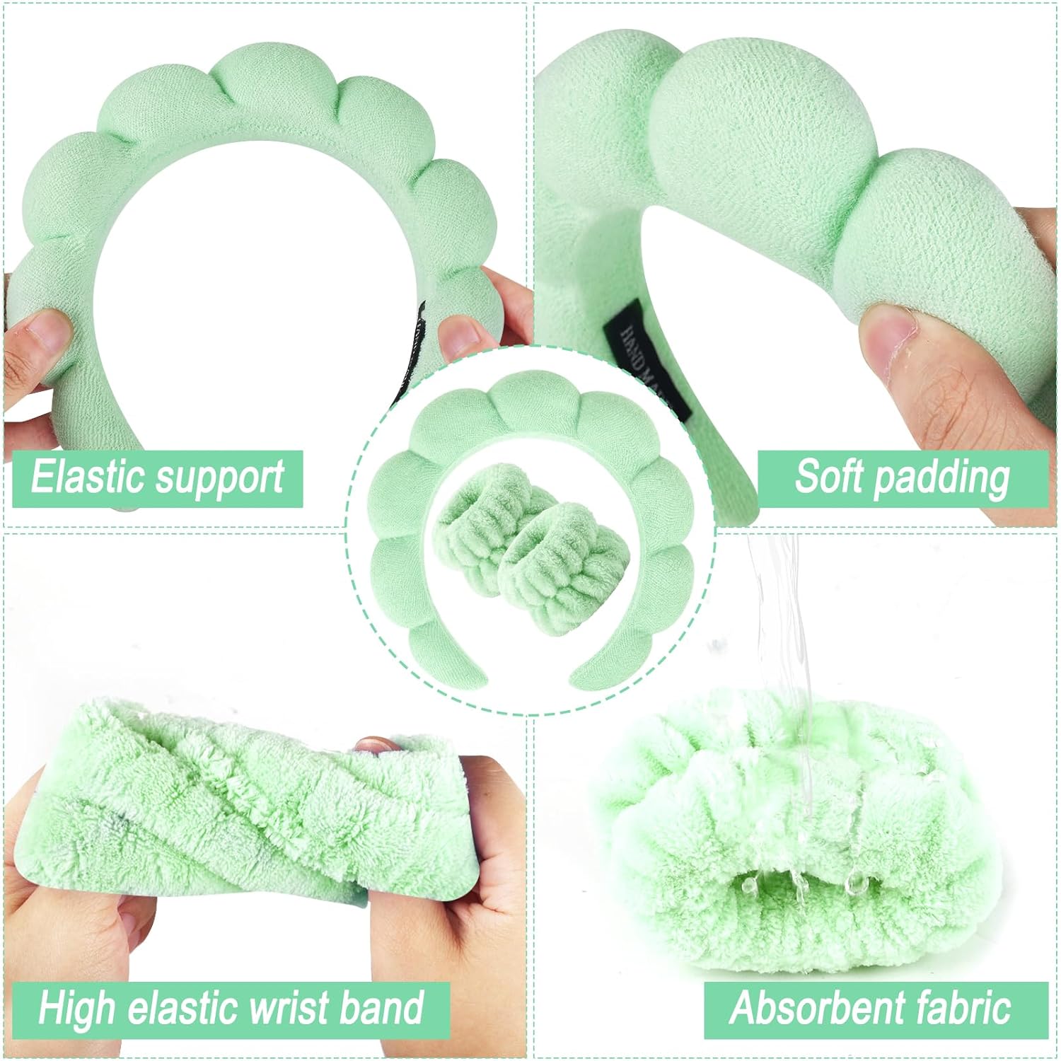 Zkptops Spa Headband for Washing Face Wristband Set Sponge Makeup Skincare Terry Cloth Bubble Soft Get Ready Hairband for Women Girl Puffy Padded Headwear Non Slip Thick Hair Accessory(Light Green)