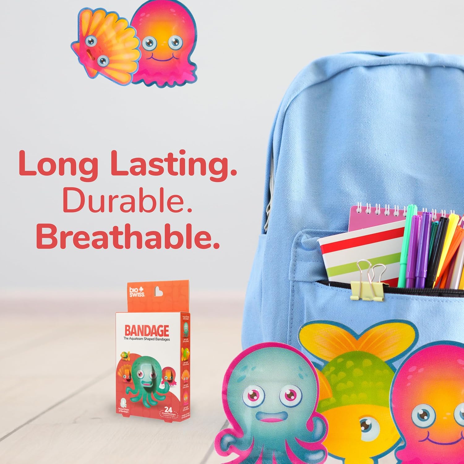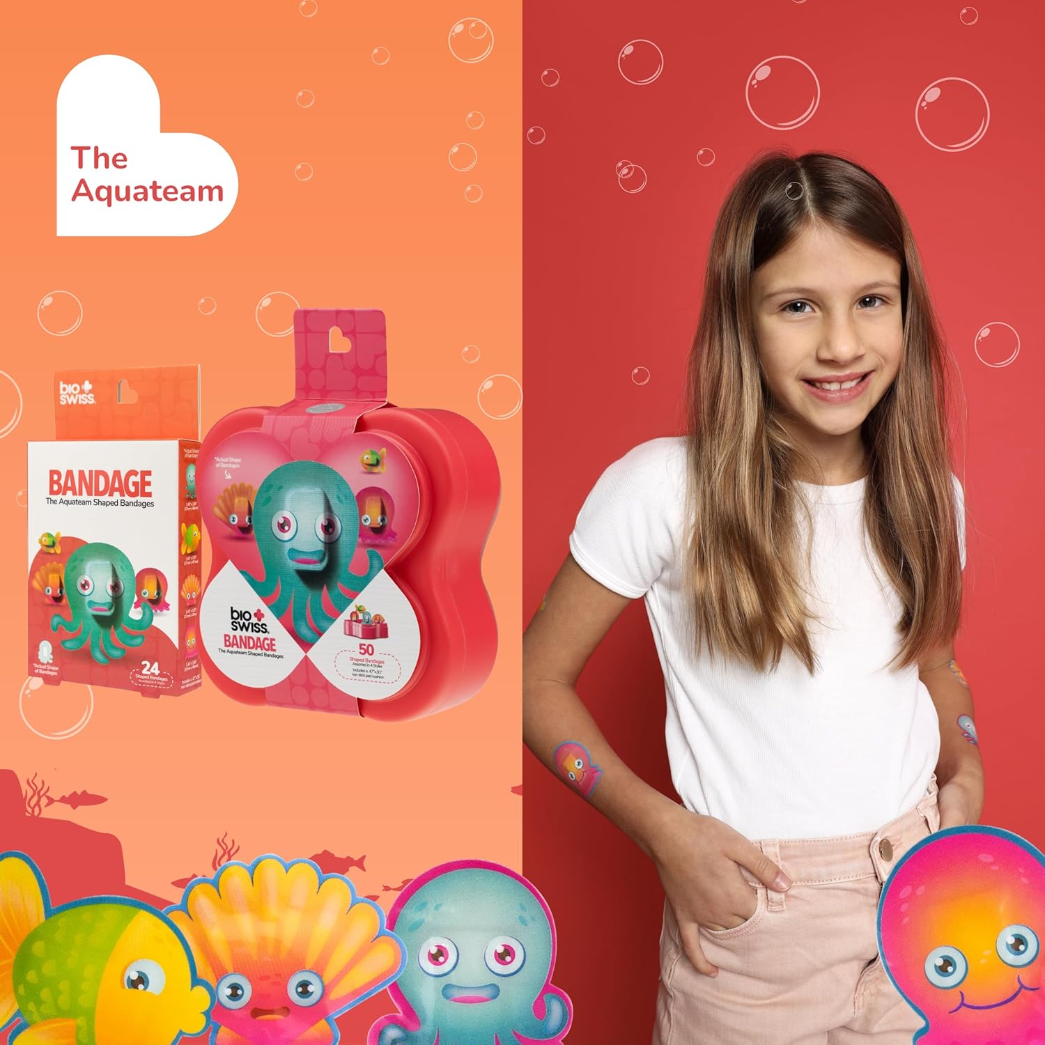 BioSwiss Kids Bandages, Aquateam Sea Creatures Shaped Self Adhesive Bandage Set, Latex Free, Sterile Wound Care, 24 Count