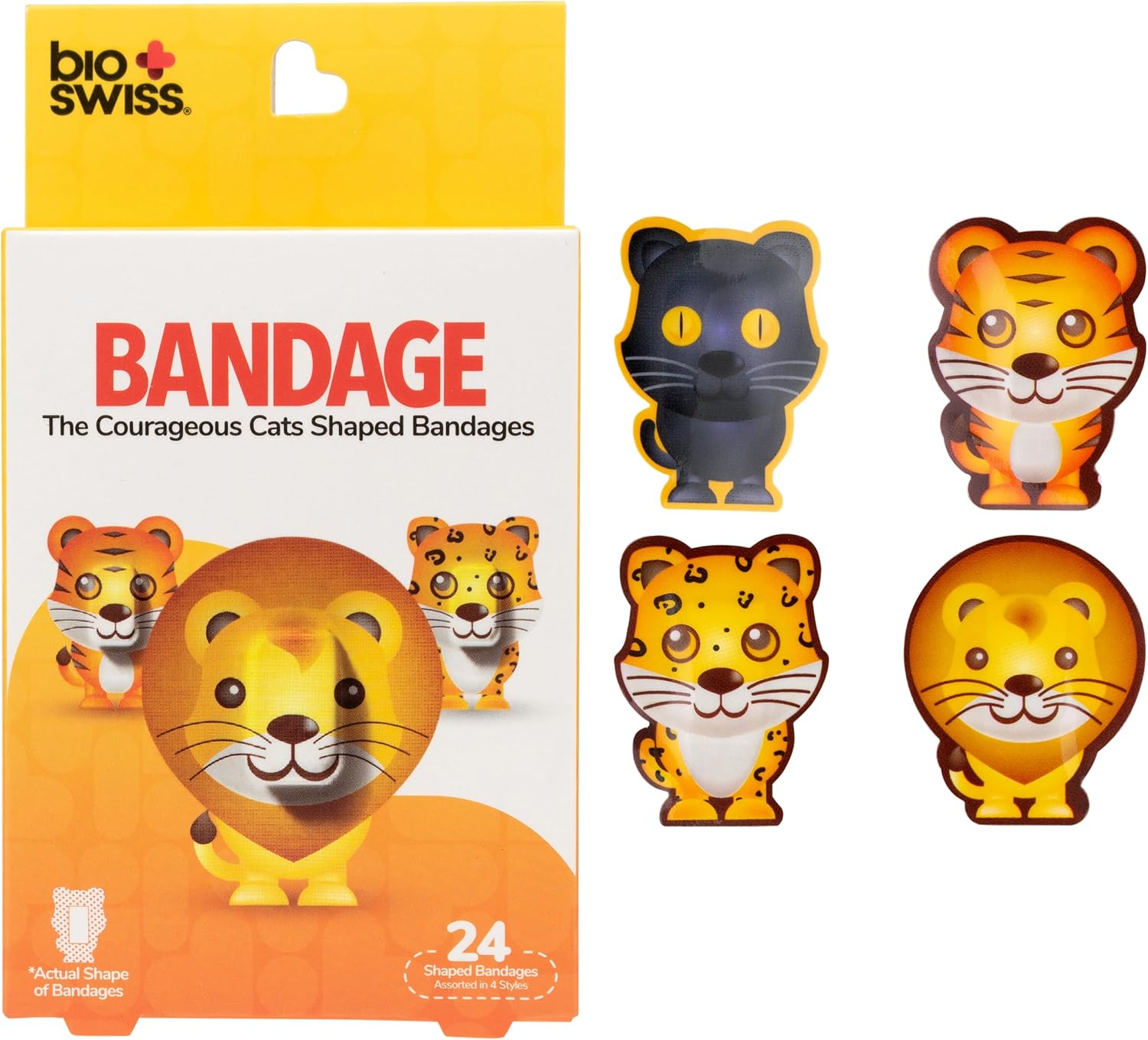 BioSwiss Kids Bandages, Courageous Cats Shaped Self Adhesive Bandage Set, Latex Free, Sterile Wound Care, 24 Count