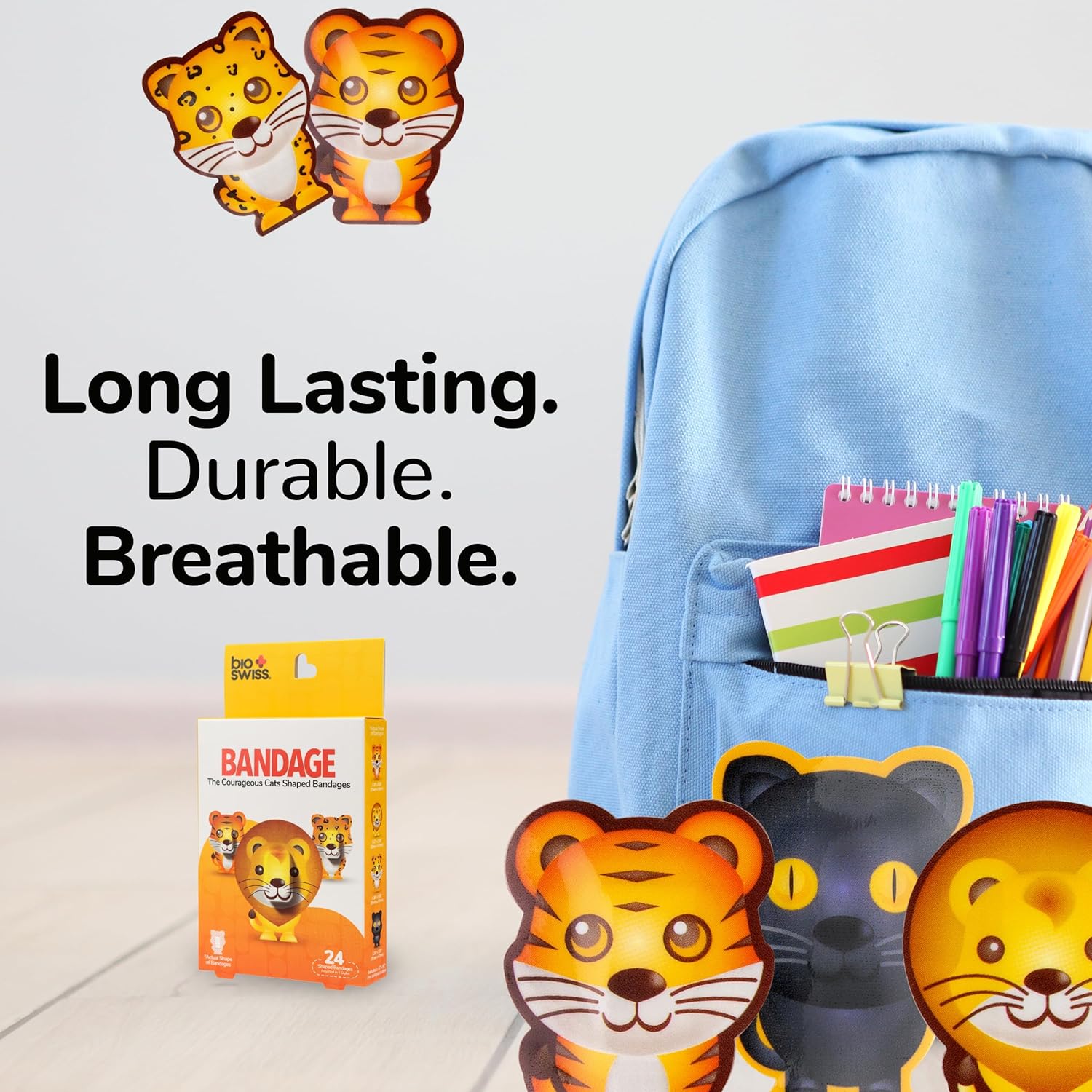 - 24 JUNGLE CAT KIDS BANDAGES: Fun cat-shaped adhesive bandages pack helps protect cuts, scrapes, and minor wounds while making healing less stressful for children; bandages come in 4 assorted styles