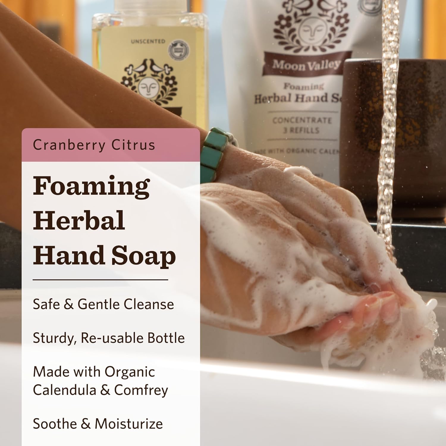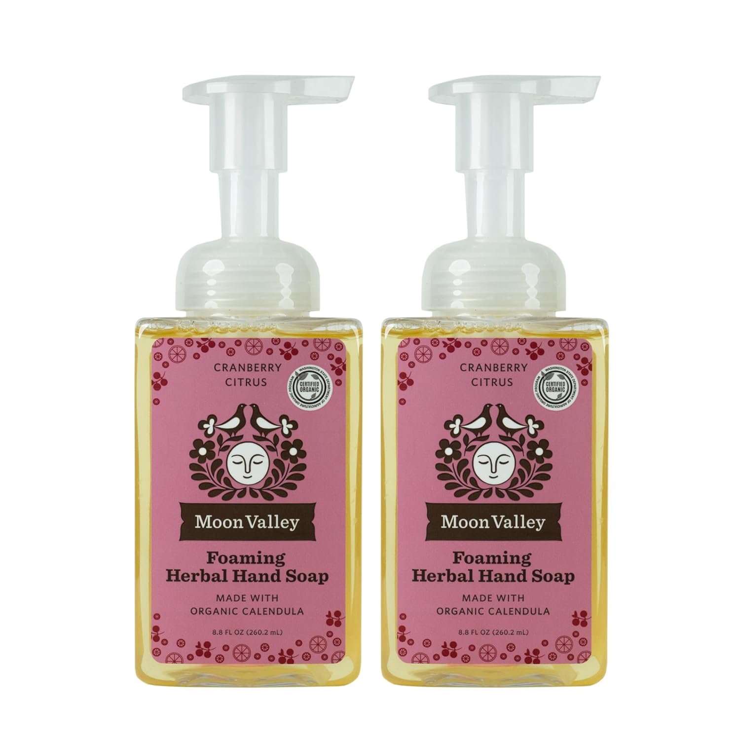 - TWO-PACK: This bundle of two 8.8oz Foaming Hand Soaps includes fresh and natural scents of Cranberry Citrus. Moon Valley Organics Herbal Foaming Hand Soaps are certified organic, vegan and non-gmo. Each bottle is recyclable. Ingredients leave hands soft and moisturized.