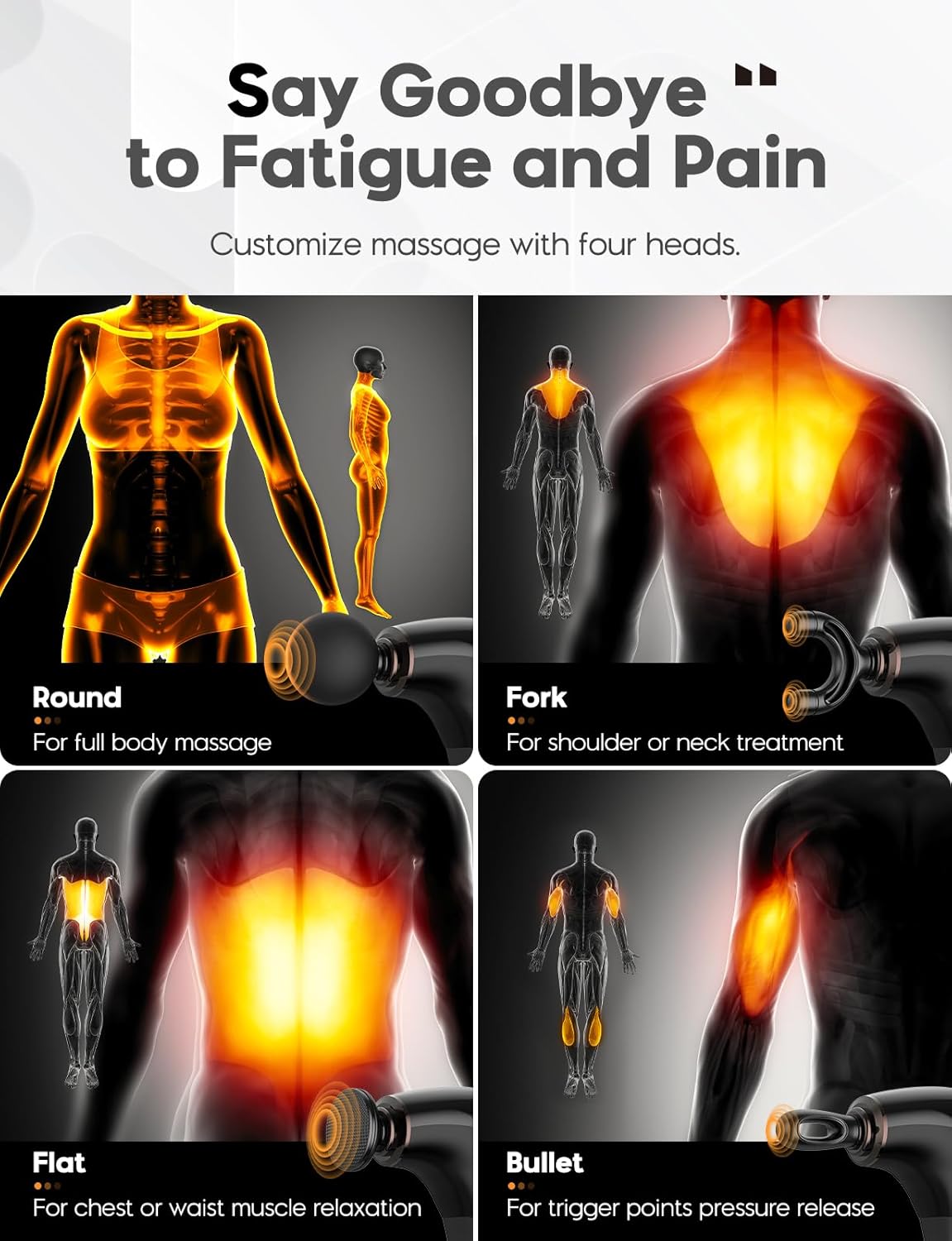 - 4 Interchangeable Heads and 5 Speed Levels. Customise your massage gun with 5 speeds 1000-2600RPM. Interchange the Deep Tissue Massage Gun's 4 unique massage heads to target different body parts, muscles and other areas of tension for effective relief from fatigue and pain