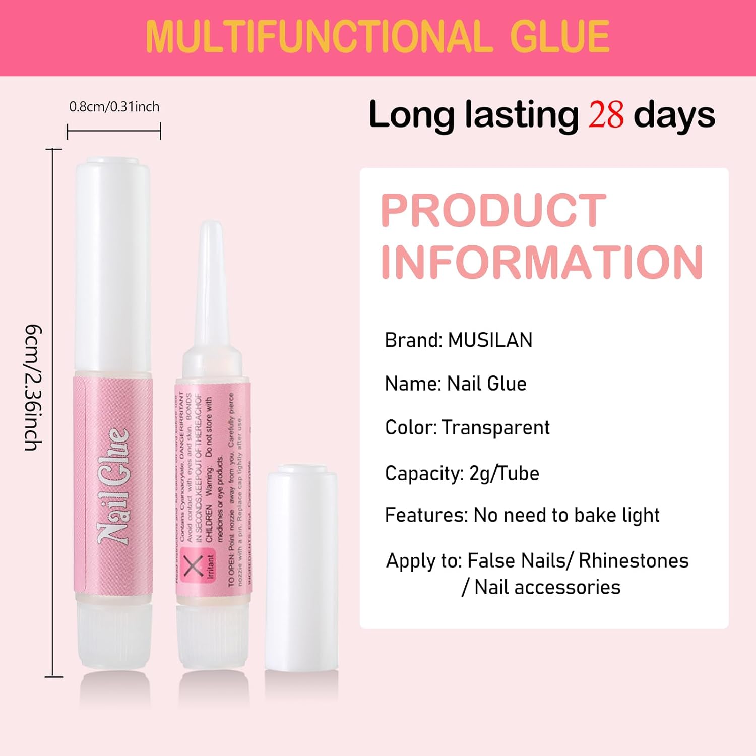 - ♥Healthy Material & Widely Uses : MUSILAN Nail Glues With MSDS and SGS certificated,False nail glues made of Ethyl Cyanoacrylate,natural resin, slight odor, no harm to your natural nails,give you comfortable nails experience. Our nail glue is perfect for sticking false nails, broken nails and small nail art decorations such as rhinestone, beads & gemstone.Nail glue can bring the salon home!