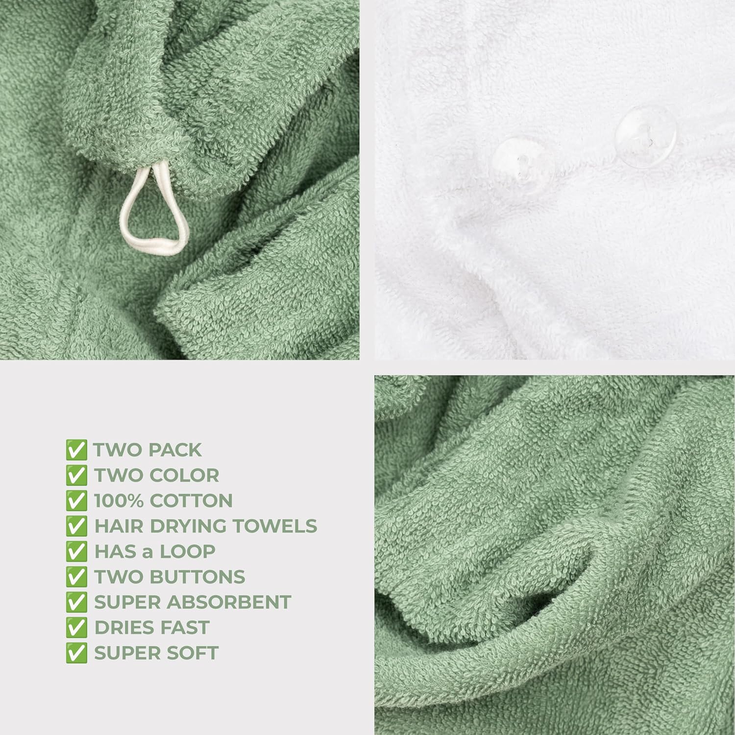 American Soft Linen 100% Cotton Hair Towels for Women, Head Towel Cap, Cotton Hair Turban Towel Wrap for Hair, Soft and Absorbent Cotton Hair Towels 2 Pack, White-Sage Green