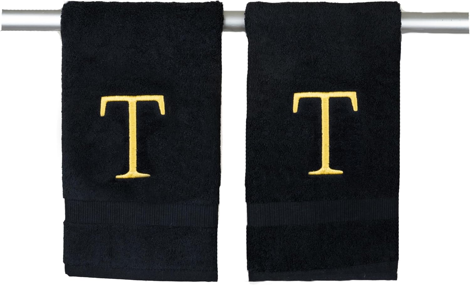Black and Gold Bathroom Hand Towel - Monogrammed Luxury Hotel Quality Decorative Embroidered Towel for Powder Room, Spa - GOTS Organic Certified - Pack of 2, Letter T
