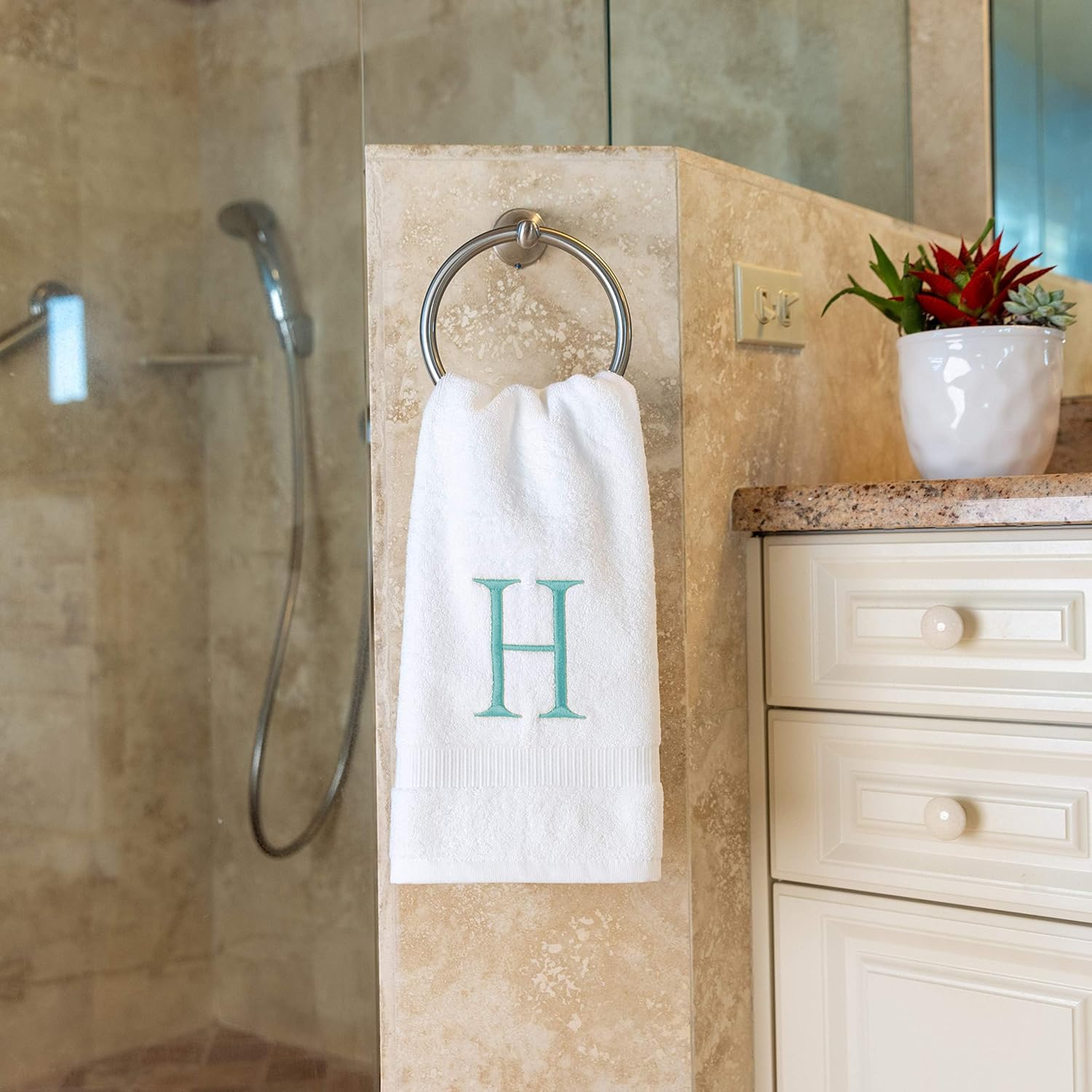 - Premium Quality - High quality durable soft rich monogram letter hand towels in white cotton with teal stitching