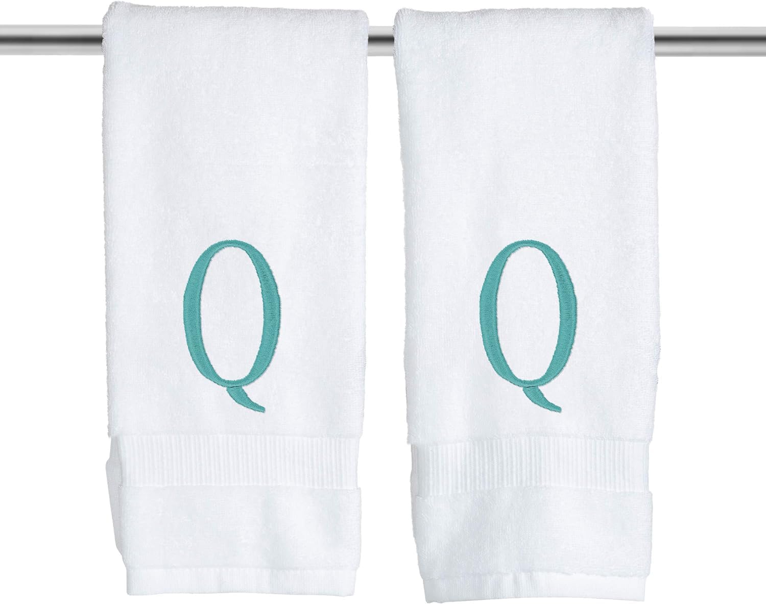 White Powder Room Hand Towel - Monogram Initial Hotel Quality Decorative Embroidered Luxury Towel for Spa - GOTS Organic Certified - Set of 2 Teal Letter Q