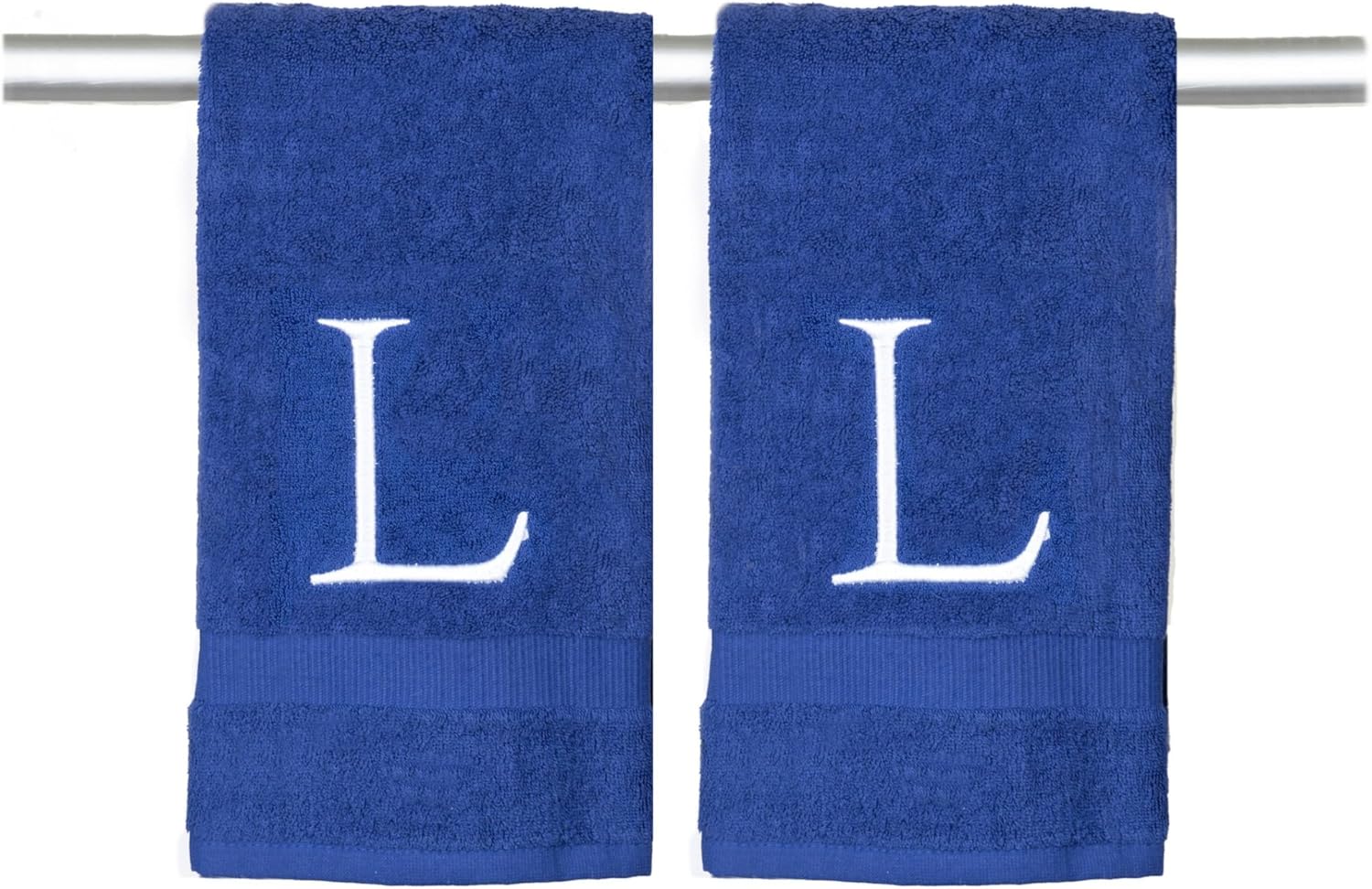 Navy and White Bathroom Hand Towel - Monogrammed Luxury Hotel Quality Decorative Embroidered Towel for Powder Room, Spa - GOTS Organic Certified - Pack of 2, Letter L