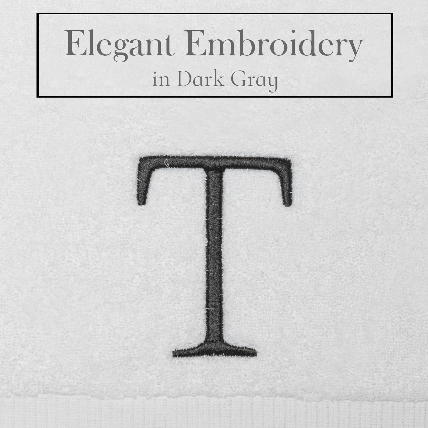 Dark Gray and White Bathroom Hand Towel - Monogrammed Luxury Hotel Quality Decorative Embroidered Towel for Powder Room, Spa - GOTS Organic Certified - Pack of 2, Letter T