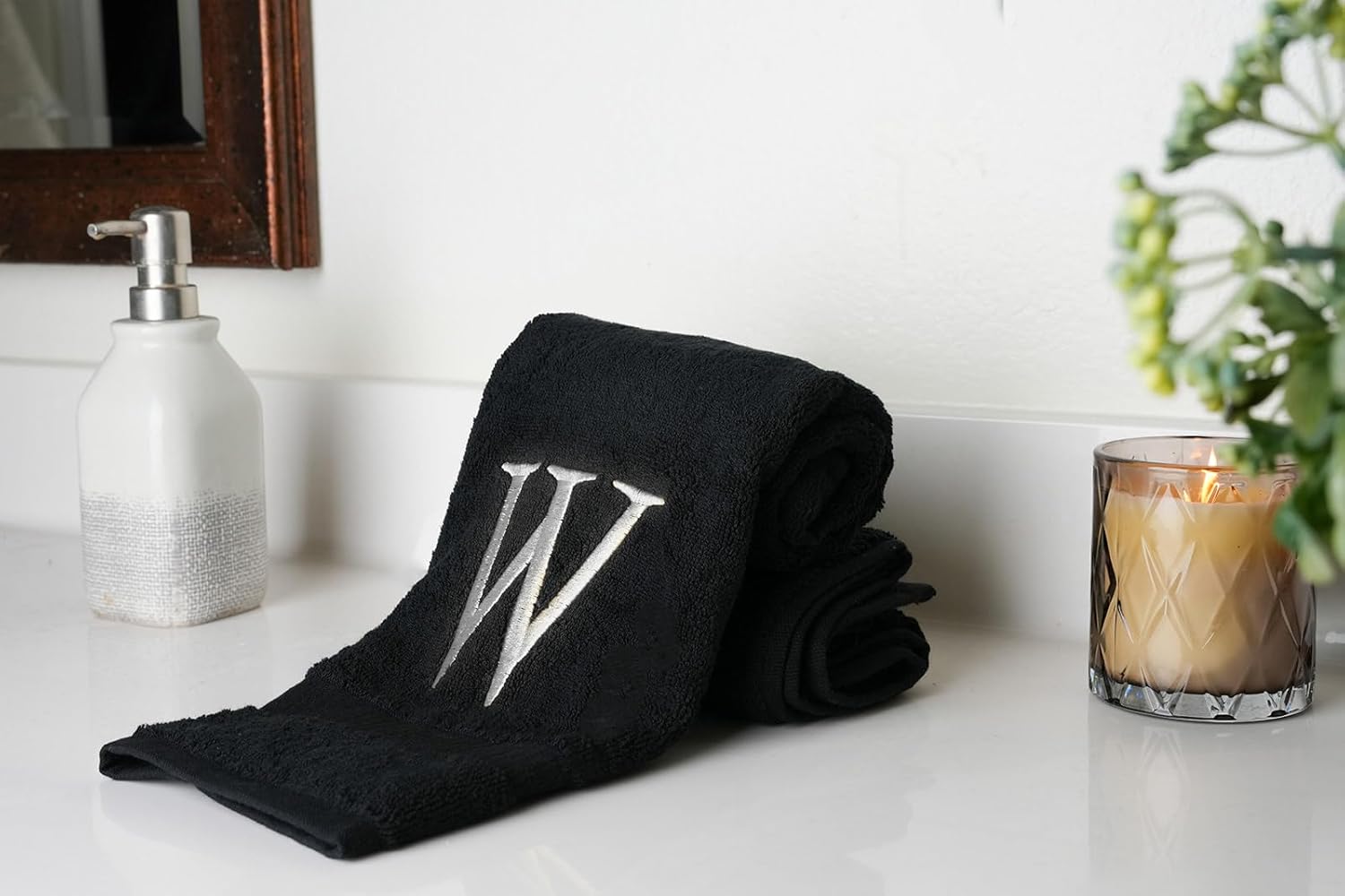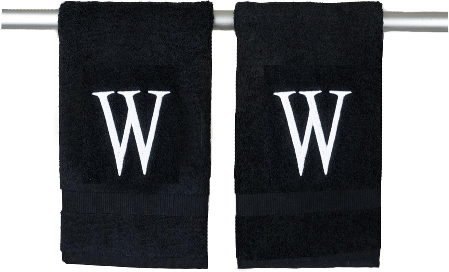 Black Luxury Hand Towel for Bathroom - Monogrammed Initial Hotel Quality Decorative Embroidered Towel for Powder Room, Spa - GOTS Organic Certified - Pack of 2 - Letter W