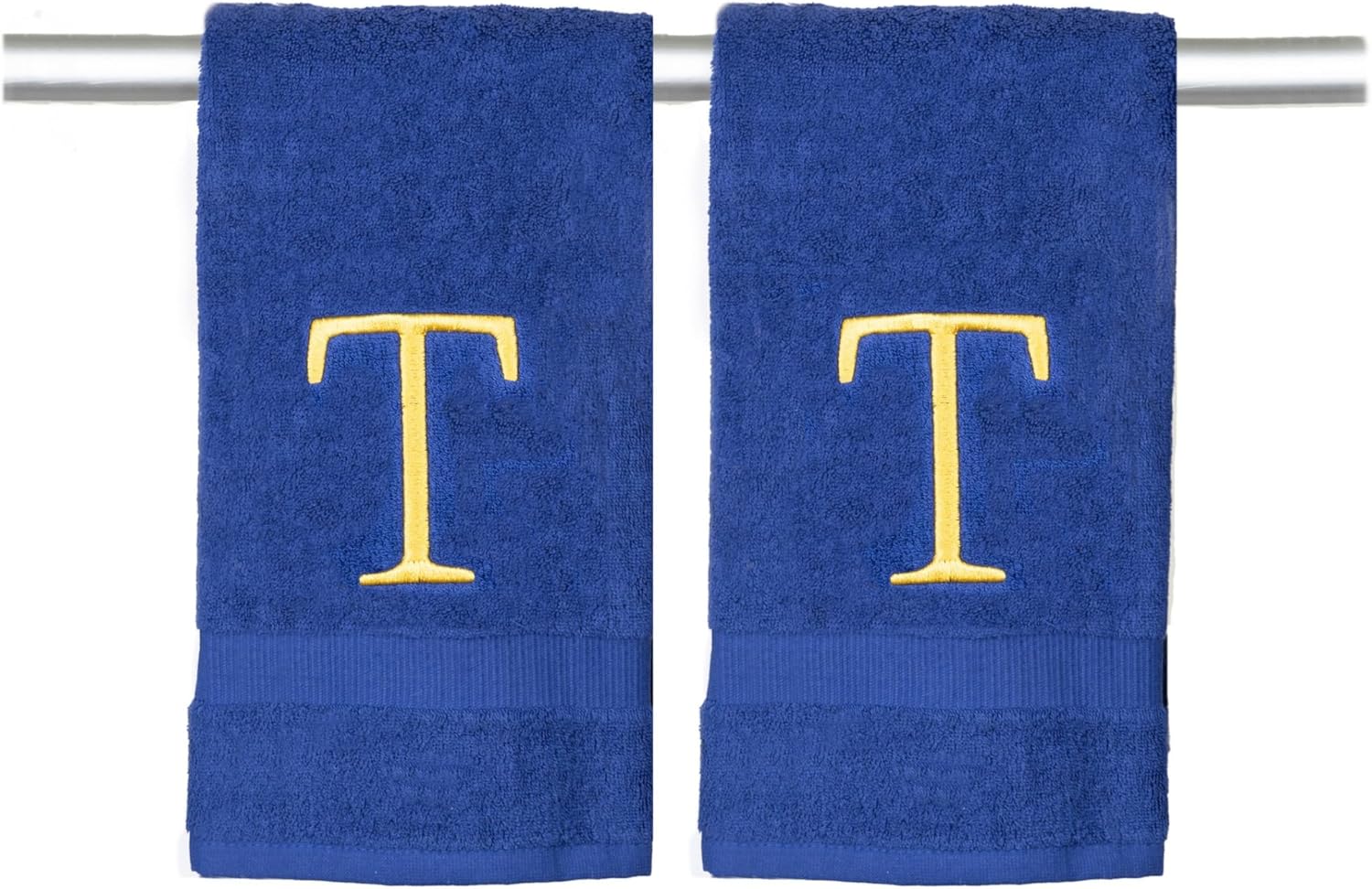 Navy Bathroom Hand Towel - Monogrammed Luxury Hotel Quality Decorative Embroidered Towel for Powder Room, Spa - GOTS Organic Certified - Set of 2 Gold Letter T