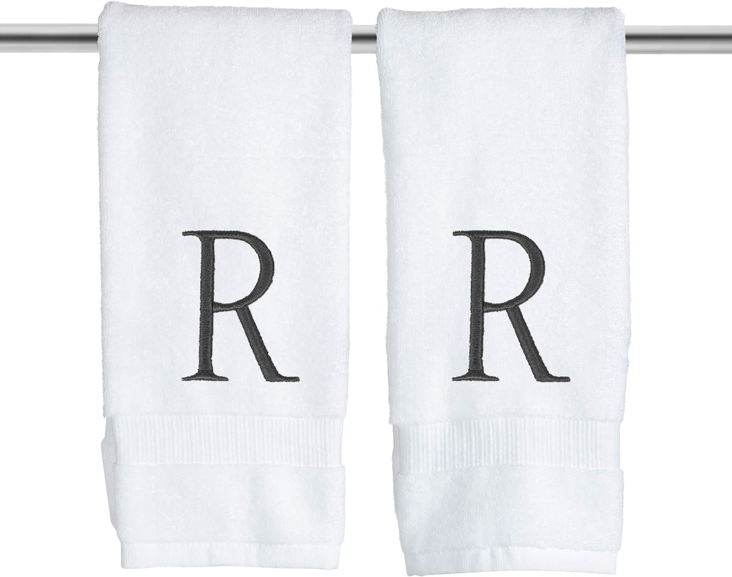 White and Black Monogrammed Hand Towel - Monogram Initial Hotel Quality Decorative Embroidered Luxury Towel for Powder Room, Spa - GOTS Organic Certified - Set of 2 Letter R