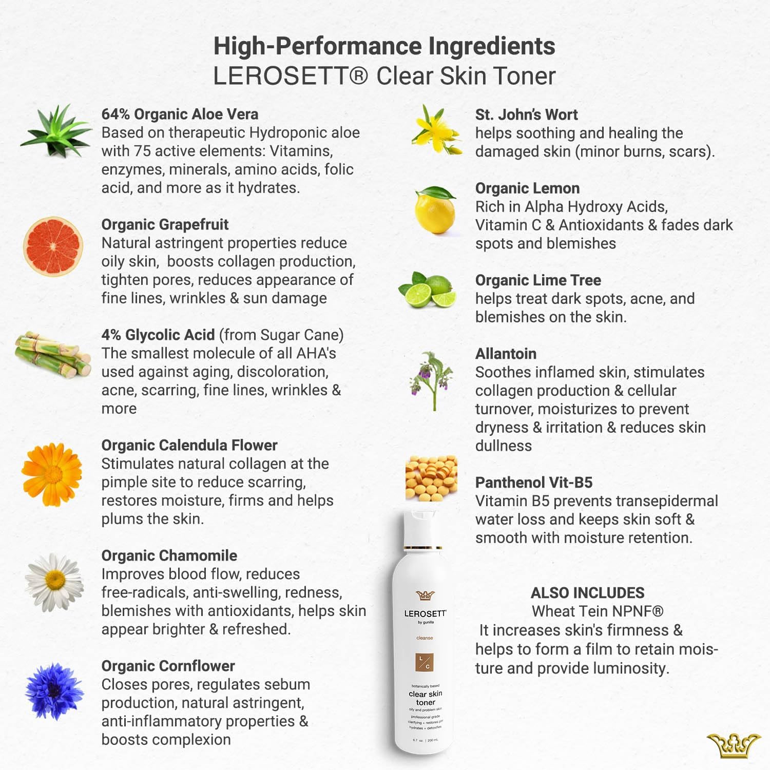 - 🌱 CLEAR SKIN YOU CAN TRUST – Rediscover your confidence with the only plant-based clear skin pH toner made with 64% aloe instead of water. LEROSETT has delivered professional-grade, plant-based skincare and acne care for over 35 years. Explore our full acne kits and treatments.