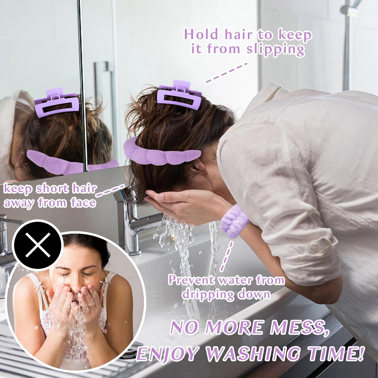 - Perfect set for washing face: say goodbye to wet arms, sleeves and mess hair while washing your face. the hair claw clips, spa headband and wristbands set are designed to prevent hair away from your face, keeping your arms and sleeves dry.