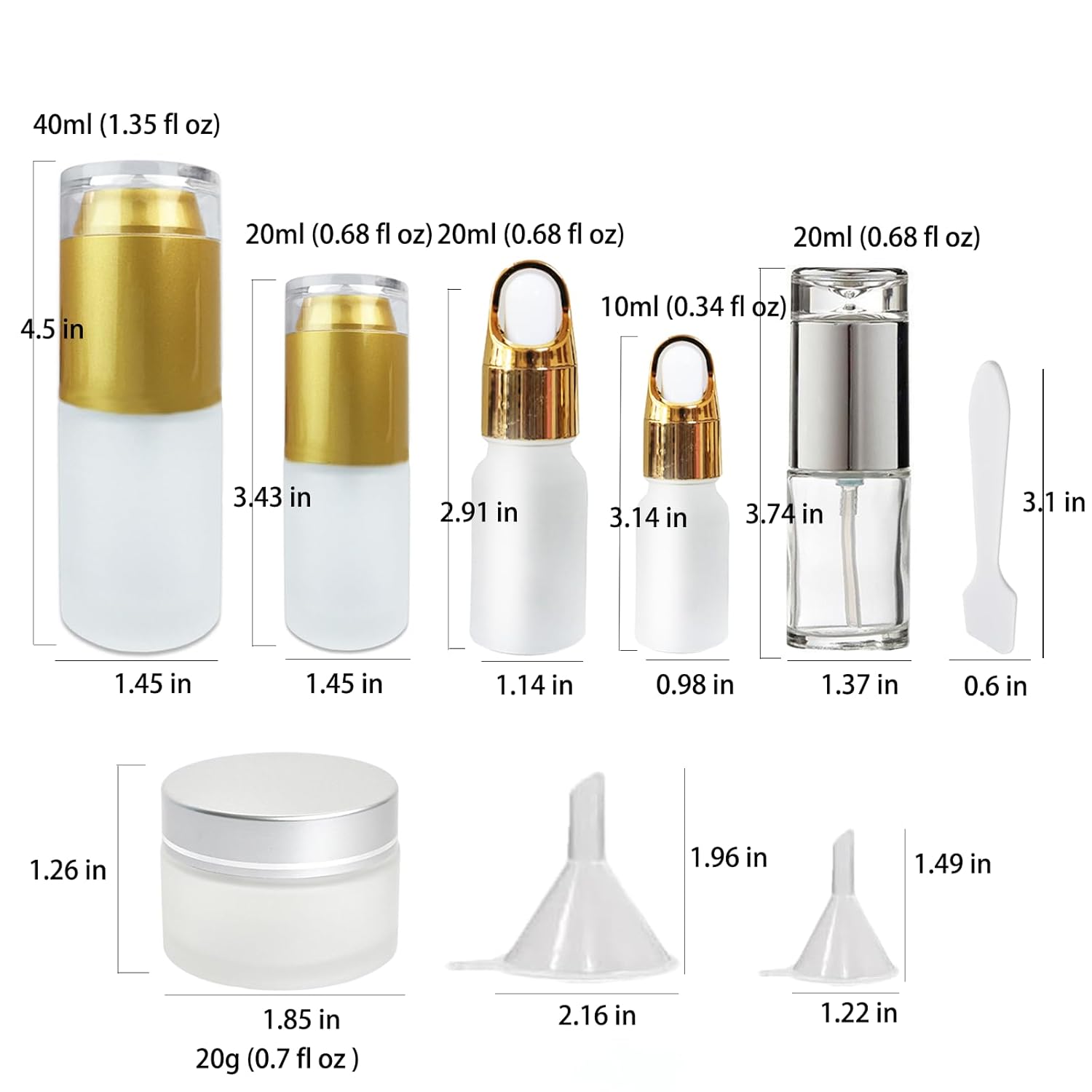 - 【Refillable & Reusable Travel Spray Bottle】We suggest including 2 travel pump bottles (1.3/0.7 oz), 2 cream jars (0.7 oz), 1 travel liquid bottle (0.7 oz), 2 essential oil bottles (0.7/0.3 oz), 2pcs funnels and 2pcs spatulas with a resealable bag into your kit. This allows for optimal utilization of limited luggage space. These skin care travel containers are perfect for various skin care products, such as toners, essential oils, cleansers, and creams etc.